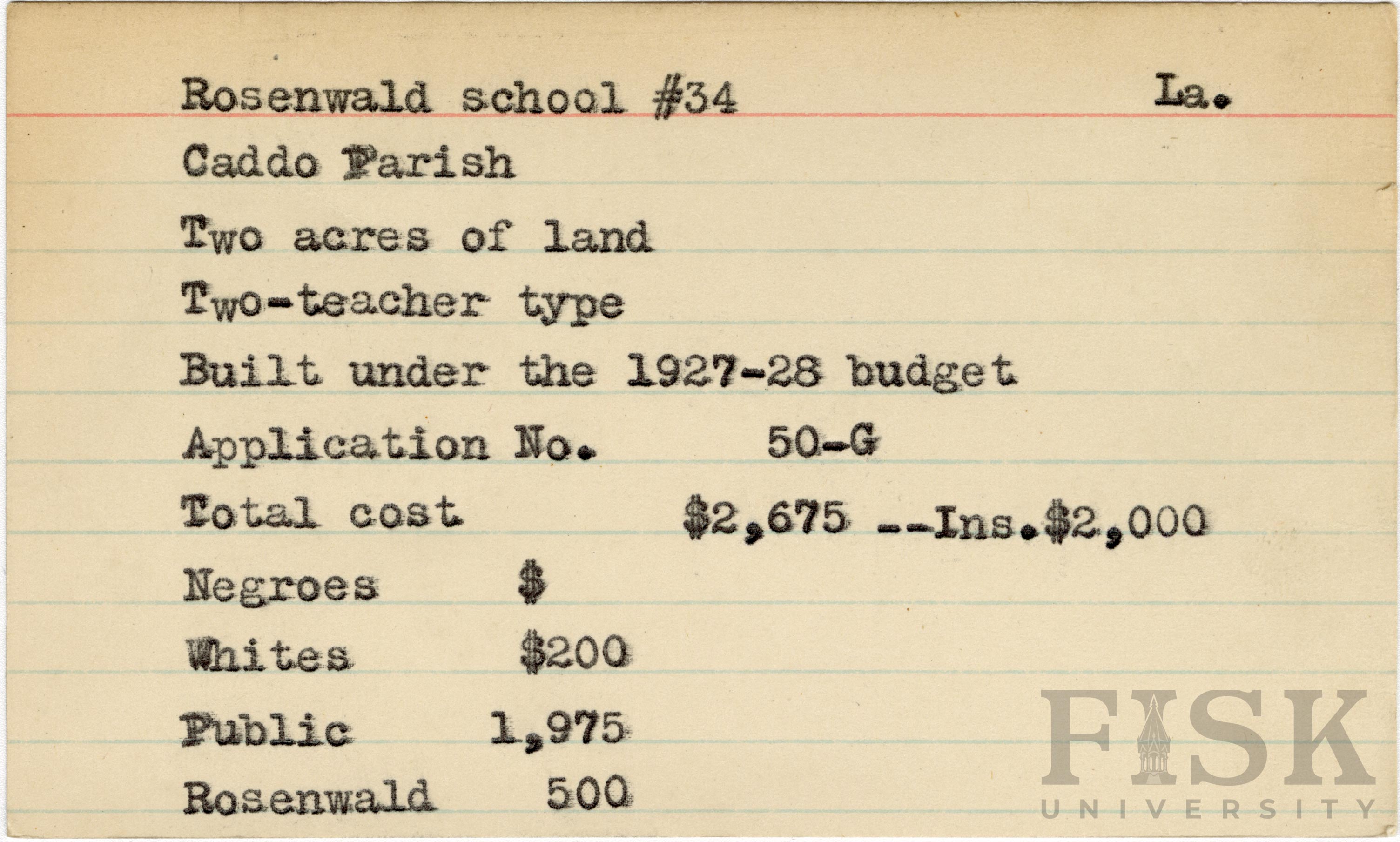 - School card from the Rosenwald Fund for Rosenwald School No. 34 with a section added to the budget contributions that says, "Ins. $2,000"