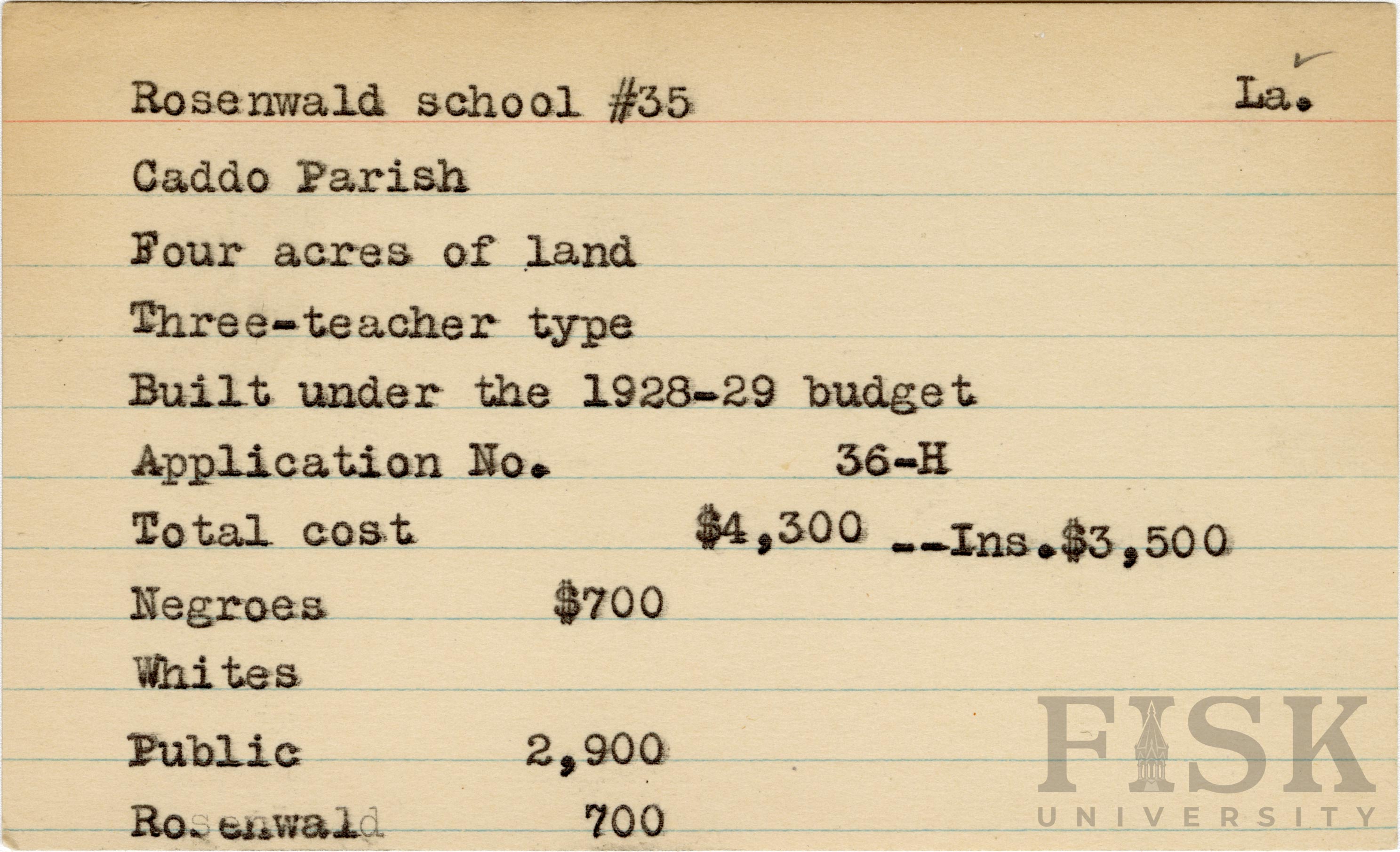 - School card from the Rosenwald Fund for Rosenwald School No. 35 in Caddo Parish, Louisiana with a section added to the budget contributions that says, "Ins. $3,500"