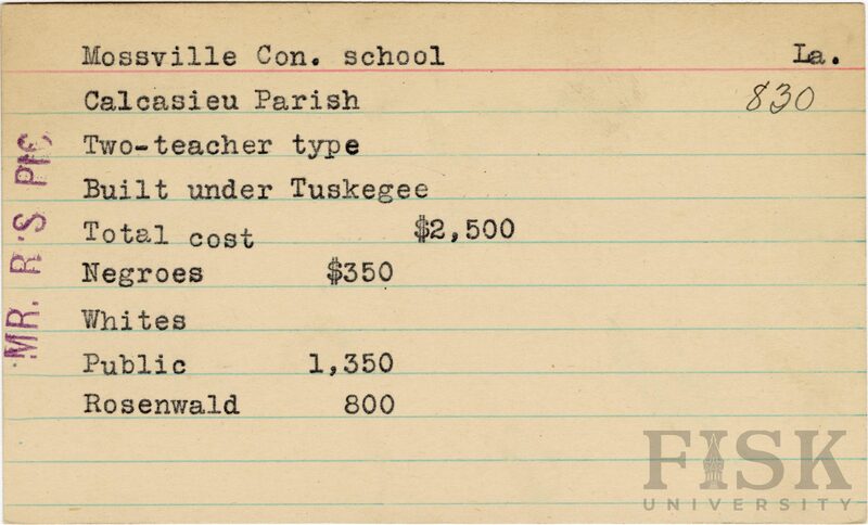 - School card from the Rosenwald Fund for Mossville Consolidated School in Calcasieu Parish, Louisiana with a note on the far left of the card that says, "Mr. R's Pic"