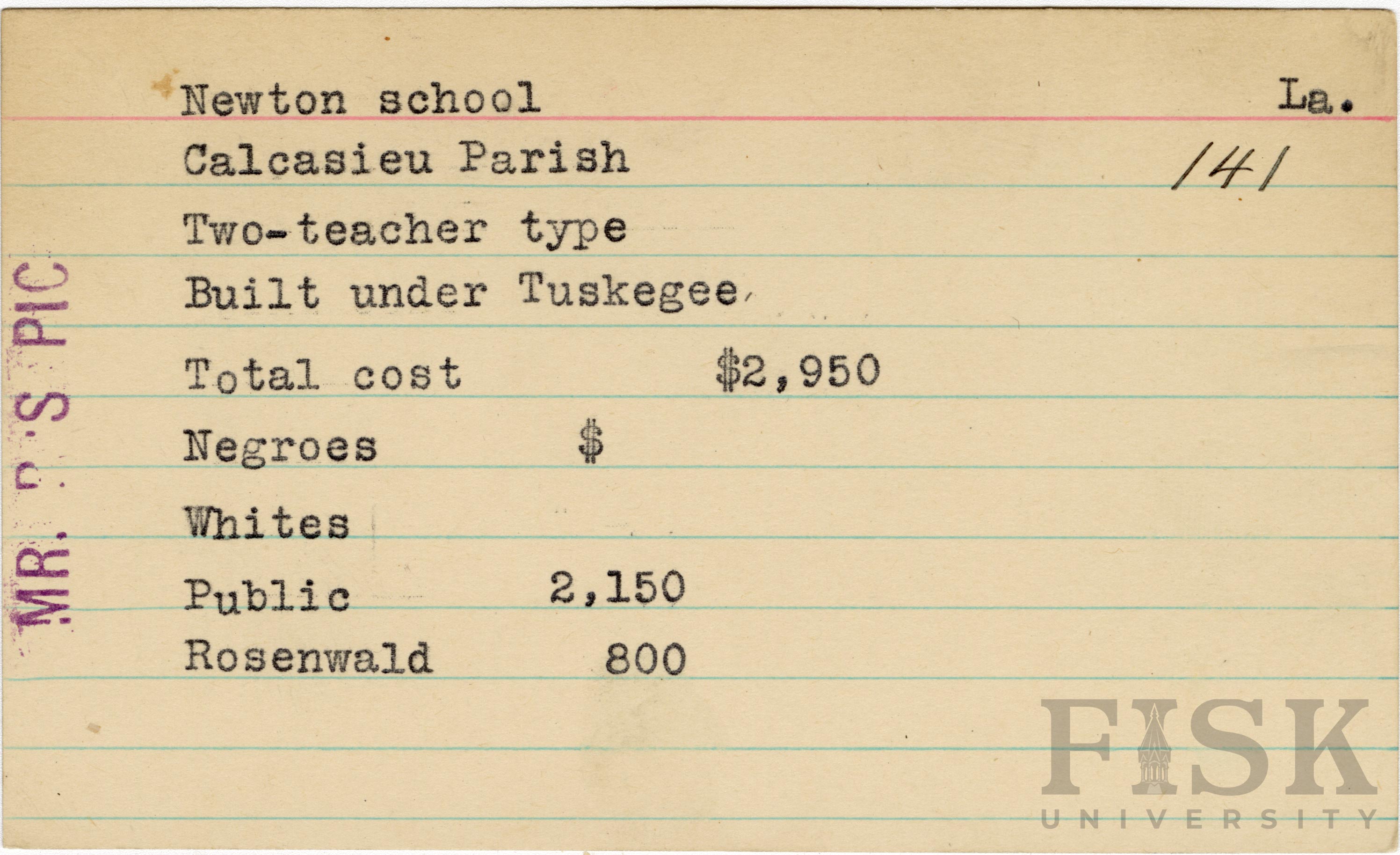 - School card from the Rosenwald Fund for Newton School in Calcasieu Parish, Louisiana with a note on the far left of the card that says, "Mr. R's Pic"