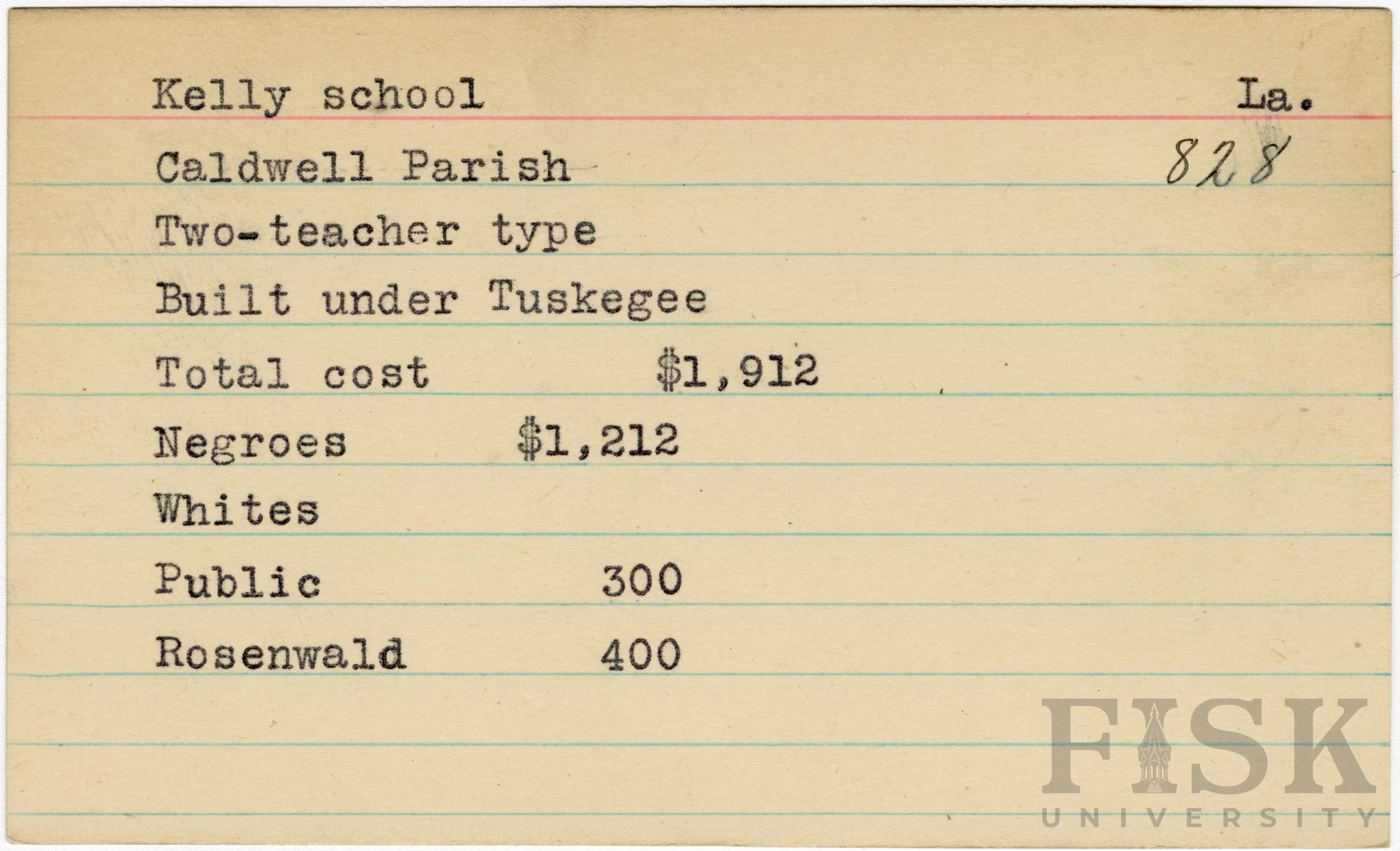 - School card from the Rosenwald Fund for Kelly School in Caldwell Parish, Louisiana