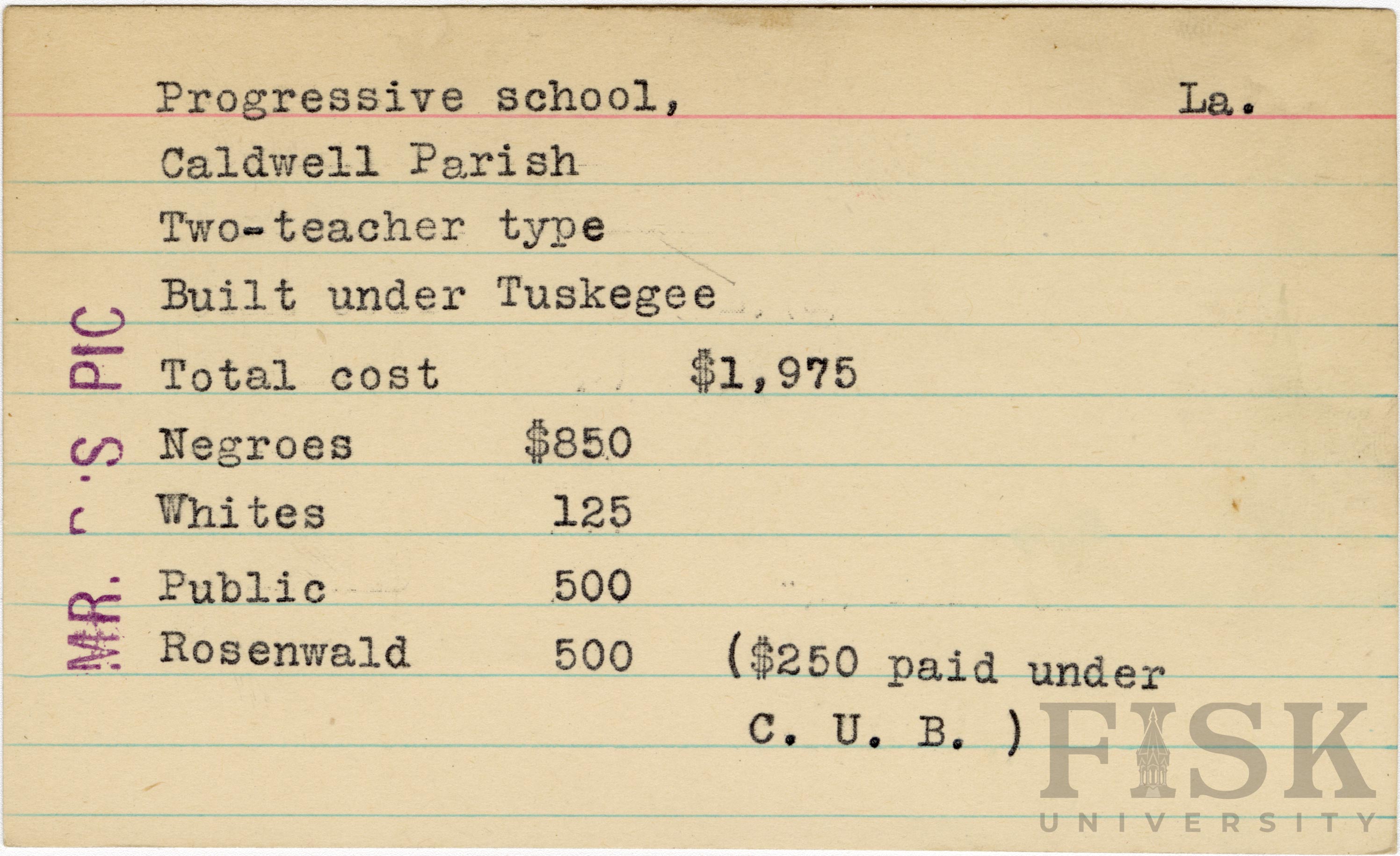 - School card from the Rosenwald Fund for Progressive School in Caldwell Parish, Louisiana with a note on the far left of the card that says, "Mr. R's Pic". An addition to the the Rosenwald budget contribution says, "($250 paid under C. U. B.)"