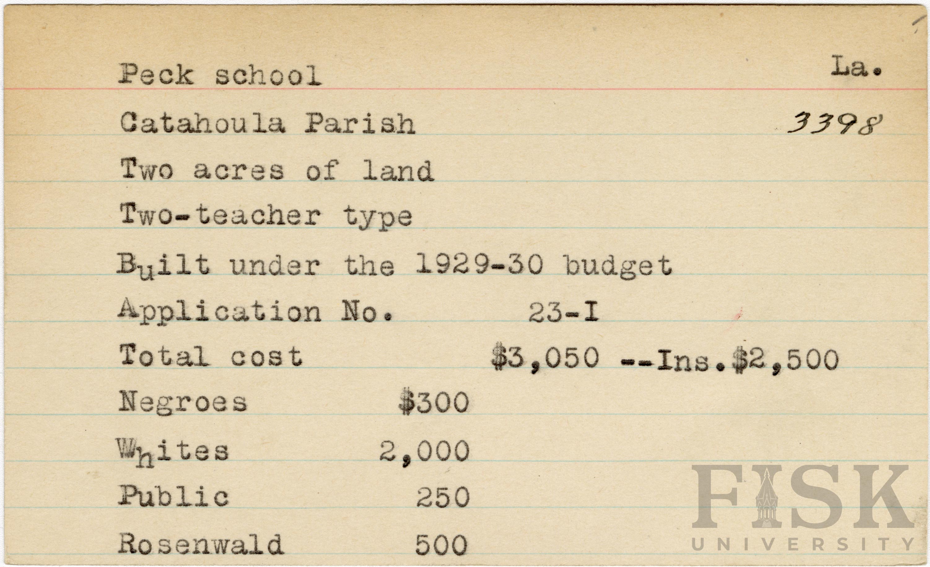 School card from the Rosenwald Fund for Peck School in Catahoula Parish, Louisiana with a section added to the budget contributions that says, "Ins. $2,500"