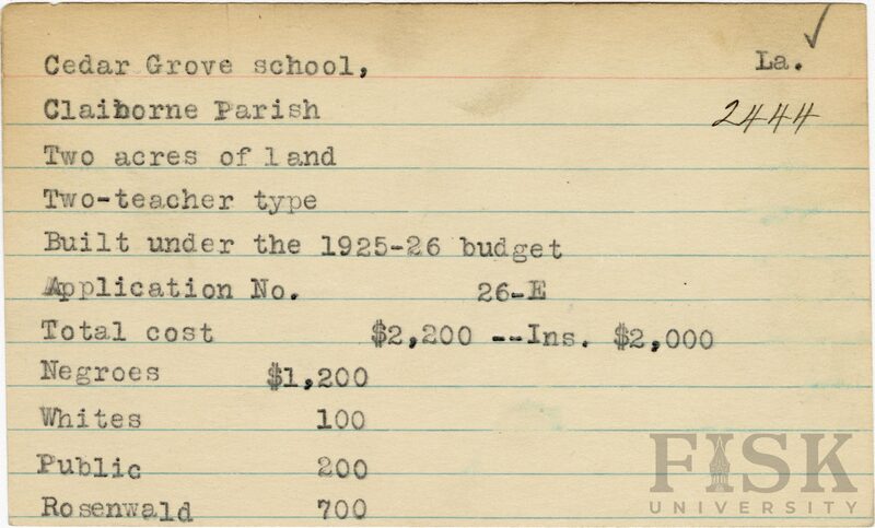School card from the Rosenwald Fund for Cedar Grove School in Claiborne Parish, Louisiana with a section added to the budget contributions that says, "Ins. $2,000"