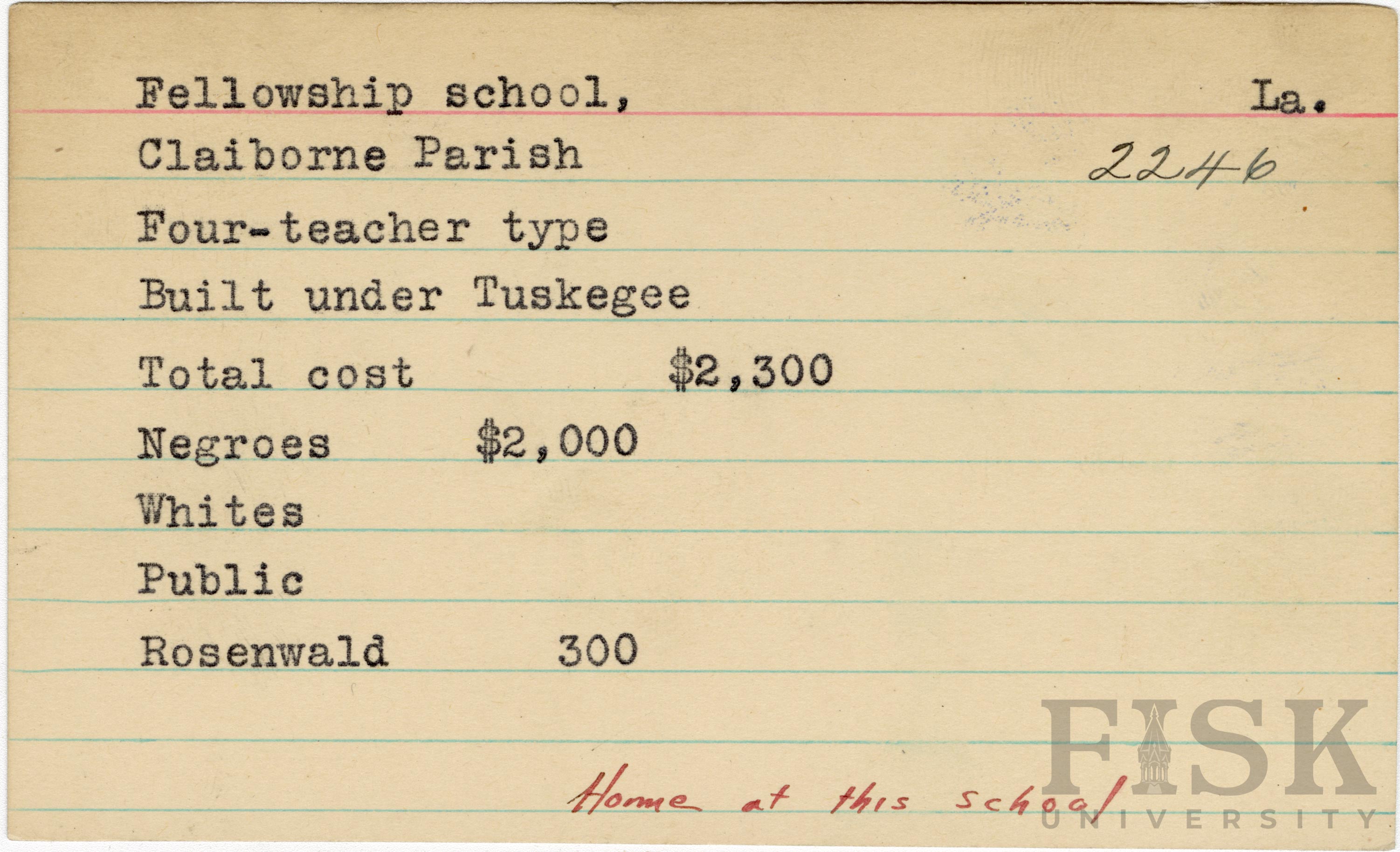 School card from the Rosenwald Fund for Fellowship School in Claiborne Parish, Louisiana with a handwritten note on the bottom of the card that says, "Home at this school"