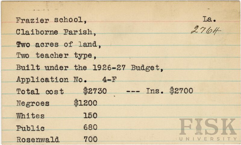 - School card from the Rosenwald Fund for Frazier School in Claiborne Parish, Louisiana with a section added to the budget contributions that says, "Ins. $2,700"
