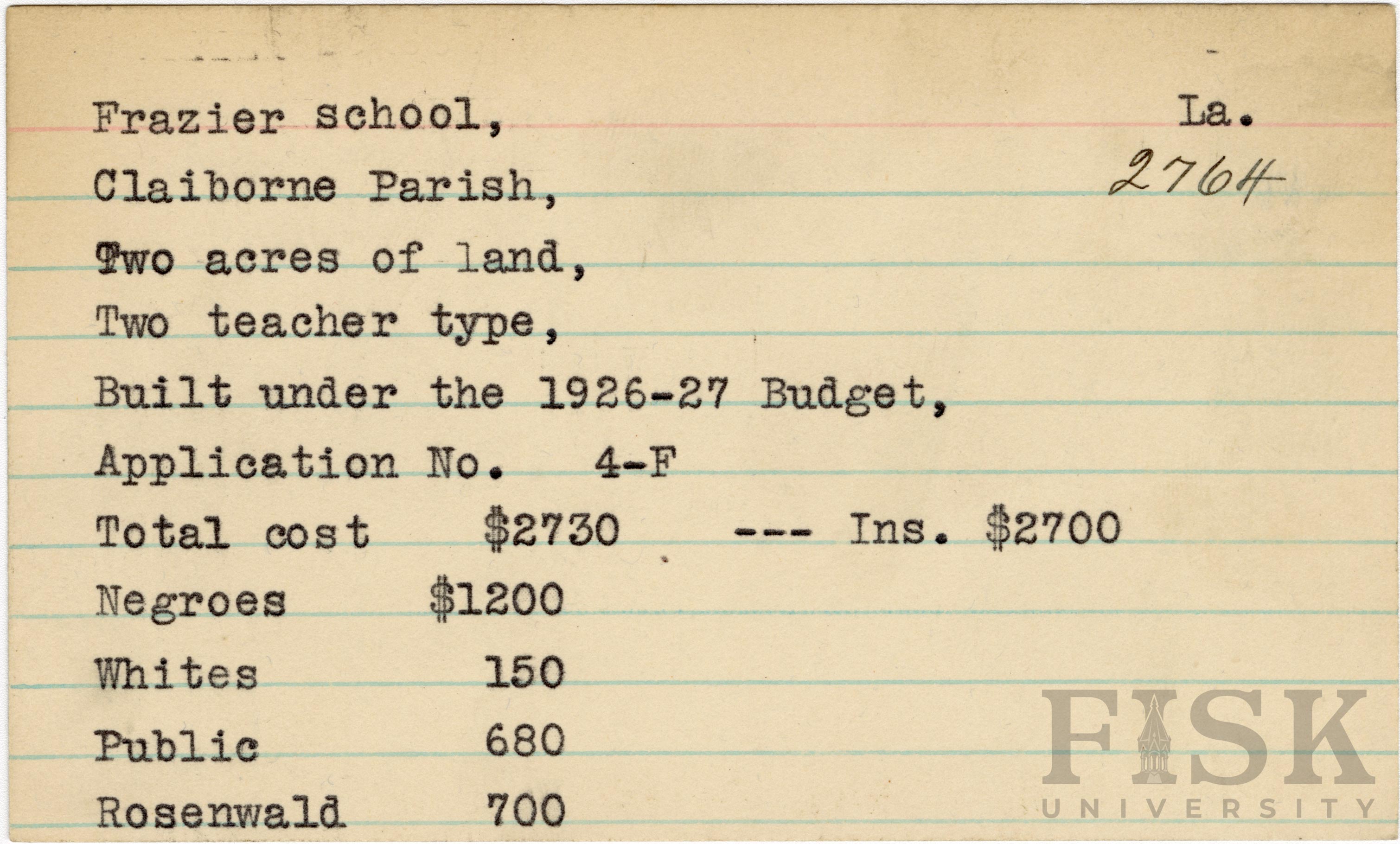 School card from the Rosenwald Fund for Frazier School in Claiborne Parish, Louisiana with a section added to the budget contributions that says, "Ins. $2,700"