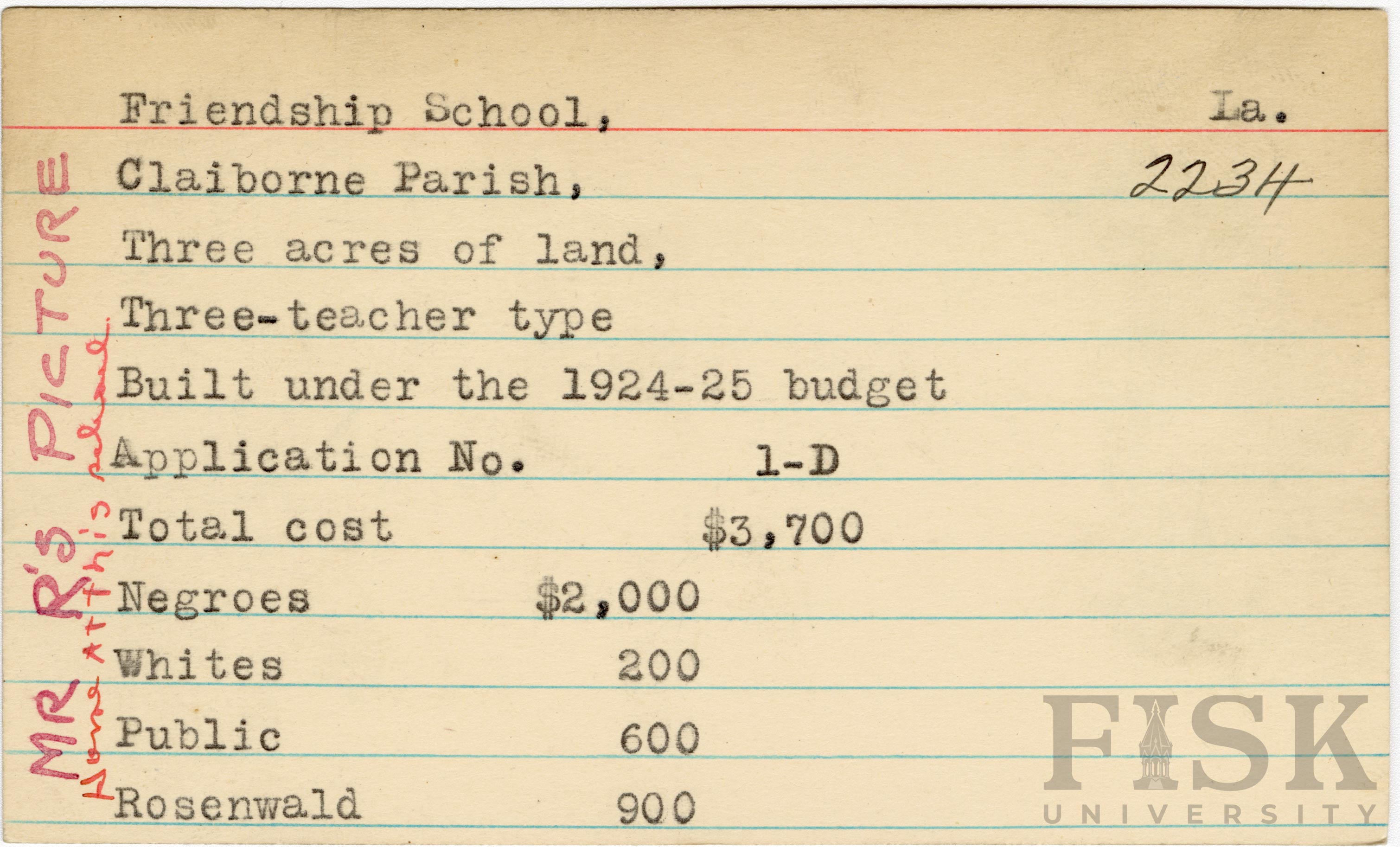 School card from the Rosenwald Fund for Friendship School in Claiborne Parish, Louisiana with handwritten notes on the far left of the card that say, "Mr. R's Picture" and "Home at this school"