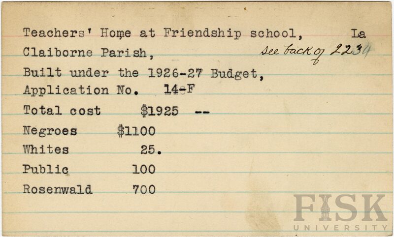 - School card from the Rosenwald Fund for the teacher's home at Friendship School in Claiborne Parish, Louisiana