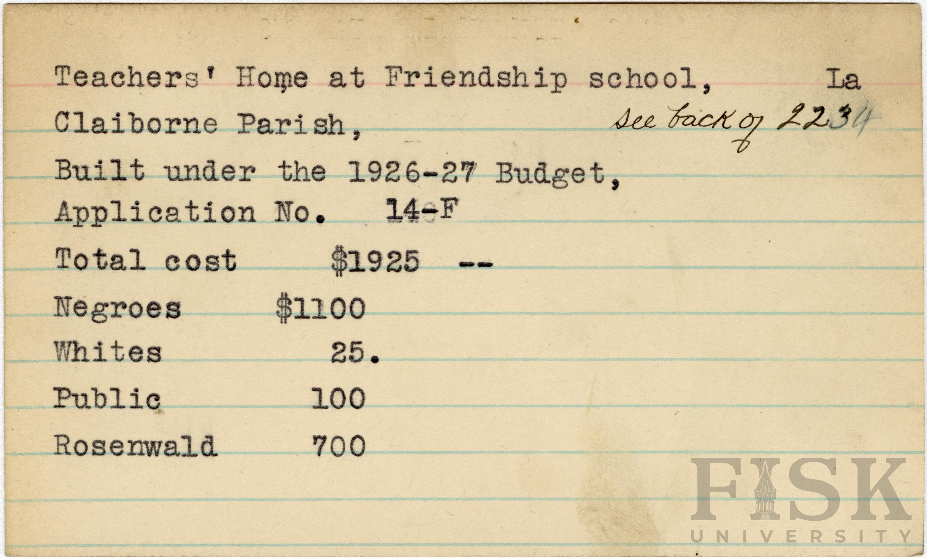School card from the Rosenwald Fund for the teacher's home at Friendship School in Claiborne Parish, Louisiana