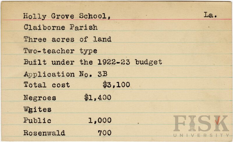 - School card from the Rosenwald Fund for Holly Grove School in Claiborne Parish, Louisiana