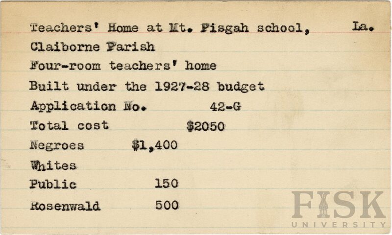 - School card from the Rosenwald Fund for the teacher's home at Mt. Pisgah School in Claiborne Parish, Louisiana