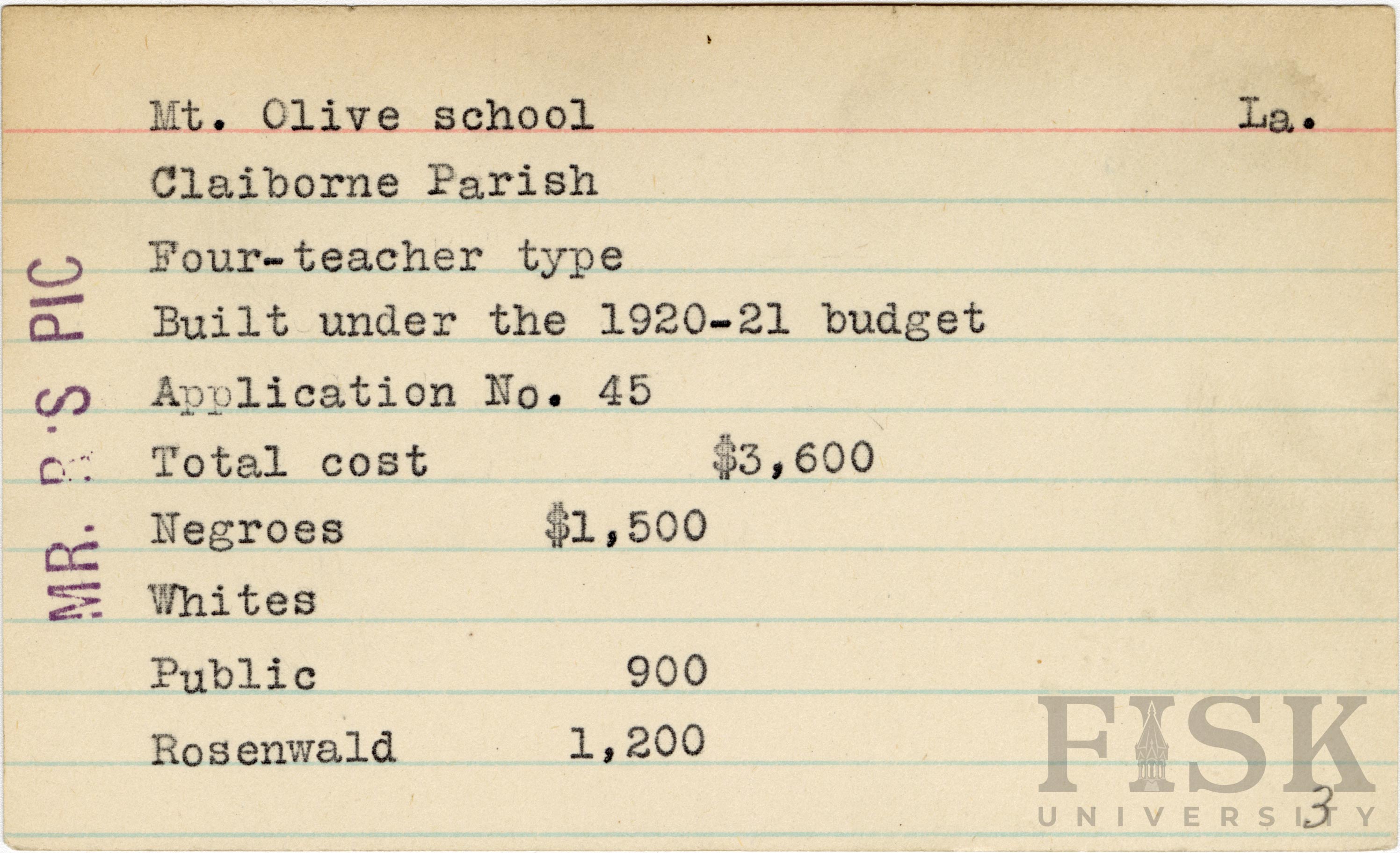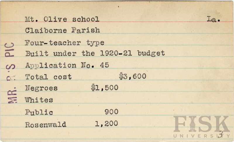 - School card from the Rosenwald Fund for Mt. Olive School in Claiborne Parish, Louisiana with a note on the far left of the card that says, "Mr. R's Pic"n