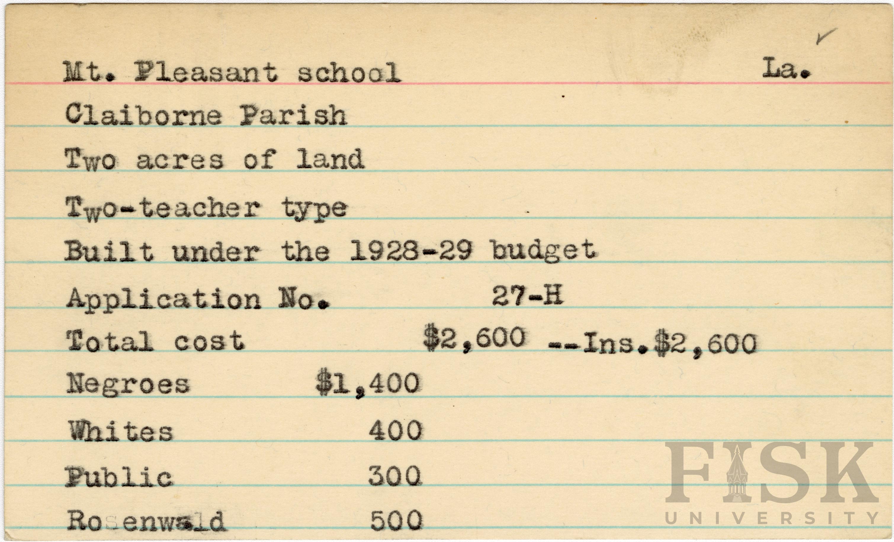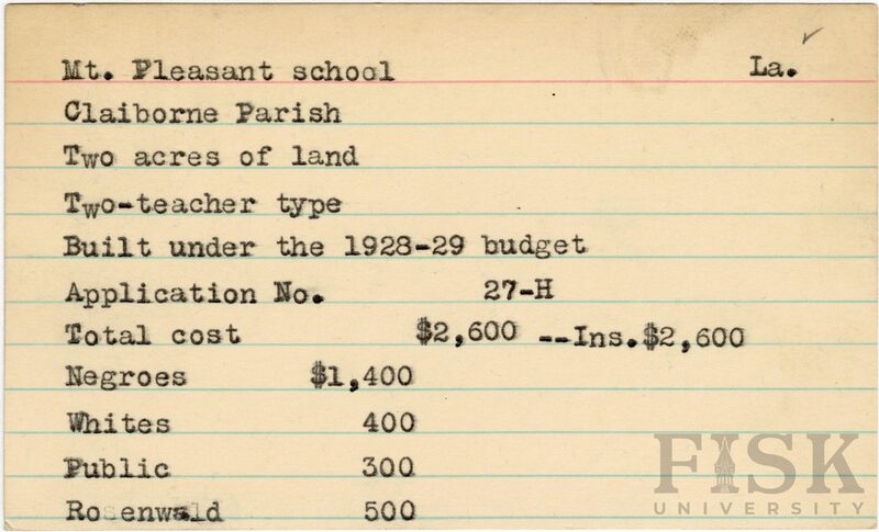 School card from the Rosenwald Fund for Mt. Pleasant School in Claiborne Parish, Louisiana with a section added to the budget contributions that says, "Ins. $2,600"