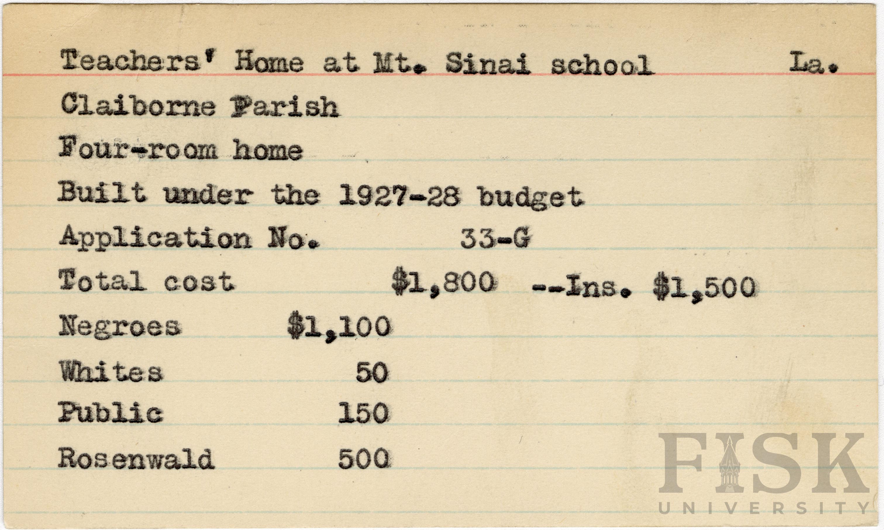 - School card from the Rosenwald Fund for the four room teacher's home at Mt. Siii School in Claiborne Parish, Louisiana with a section added to the budget contributions that says, "Ins. $1,500"