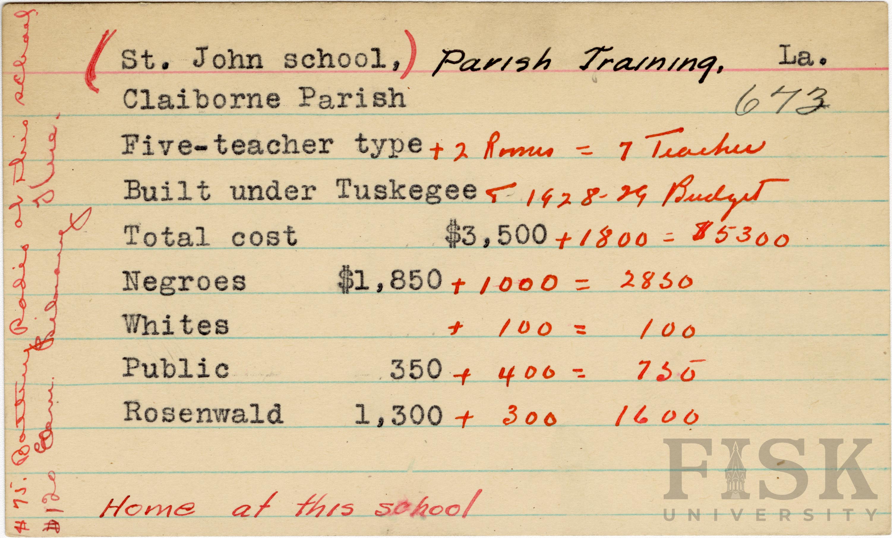 - School card from the Rosenwald Fund for St. John School in Claiborne Parish, Louisiana with handwritten additions to the teacher type, budget year, and budget contribution sections. Handwritten notes say, "$75 battery radio at this school," "$120 elem library here," and "Home at this school".