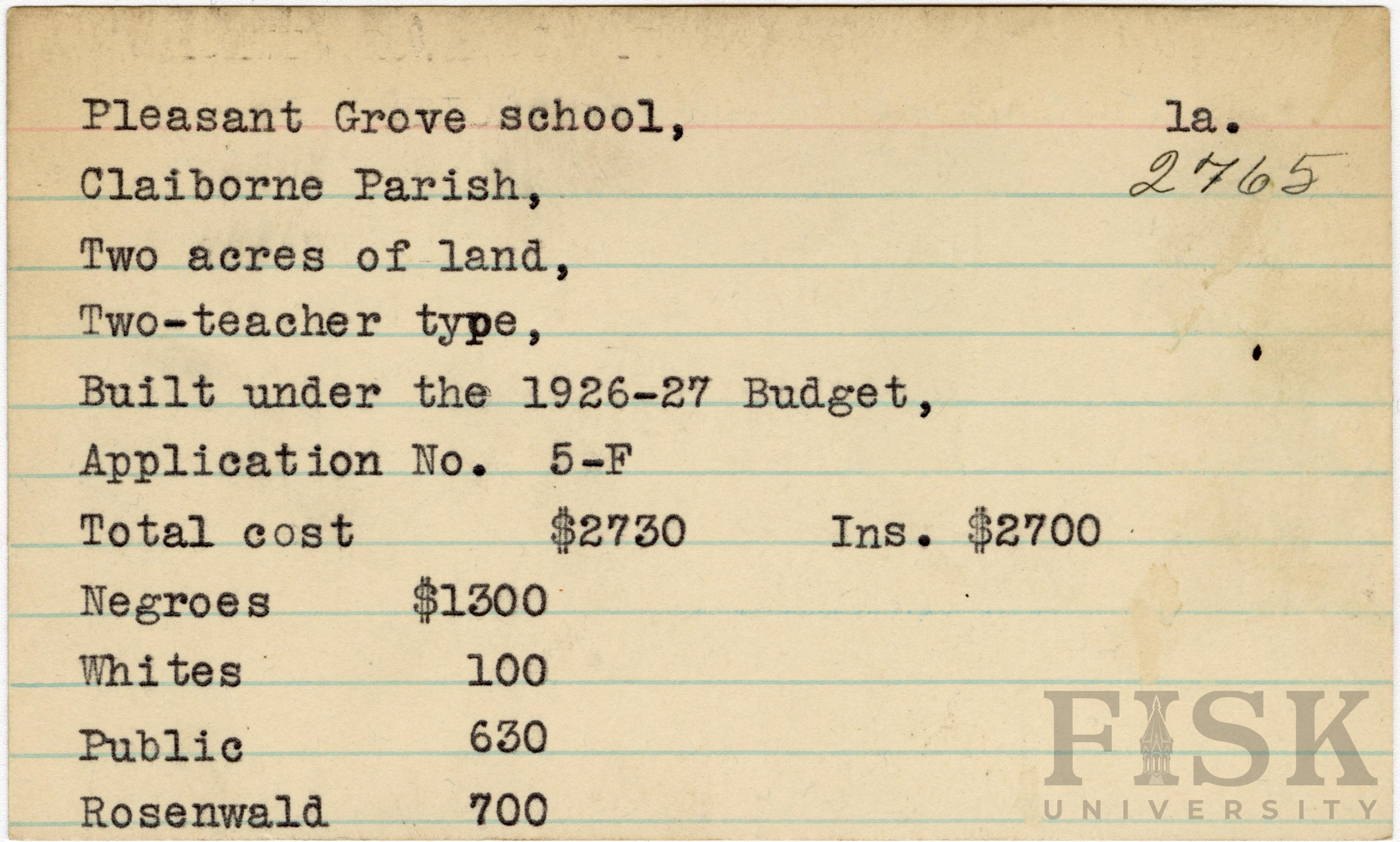 School card from the Rosenwald Fund for Pleasant Grove School in Claiborne Parish, Louisiana with a section added to the budget contributions that says, "Ins. $2,700"