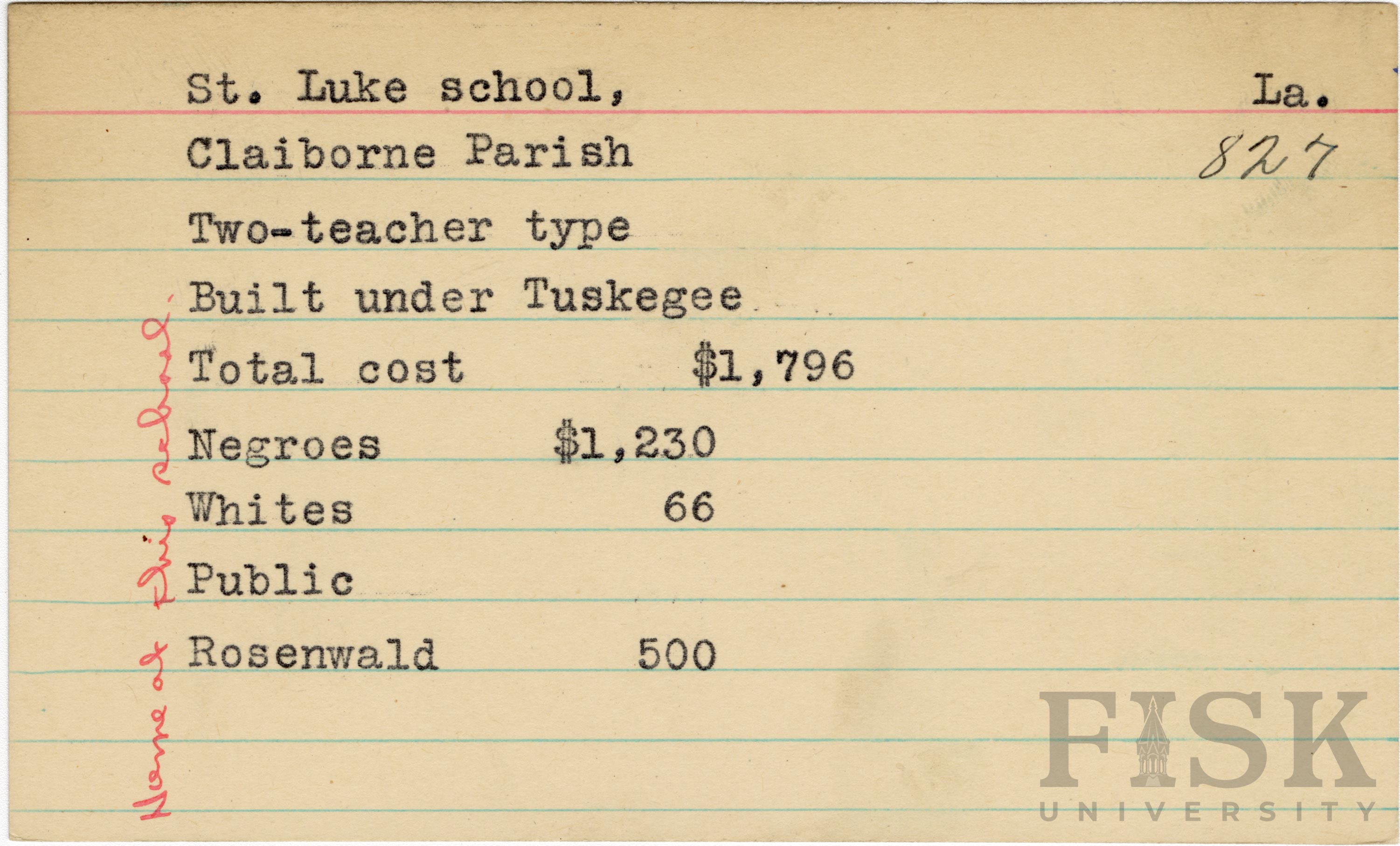 School card from the Rosenwald Fund for St. Luke School in Claiborne Parish, Louisiana with a handwritten note that says, "Home at this school"