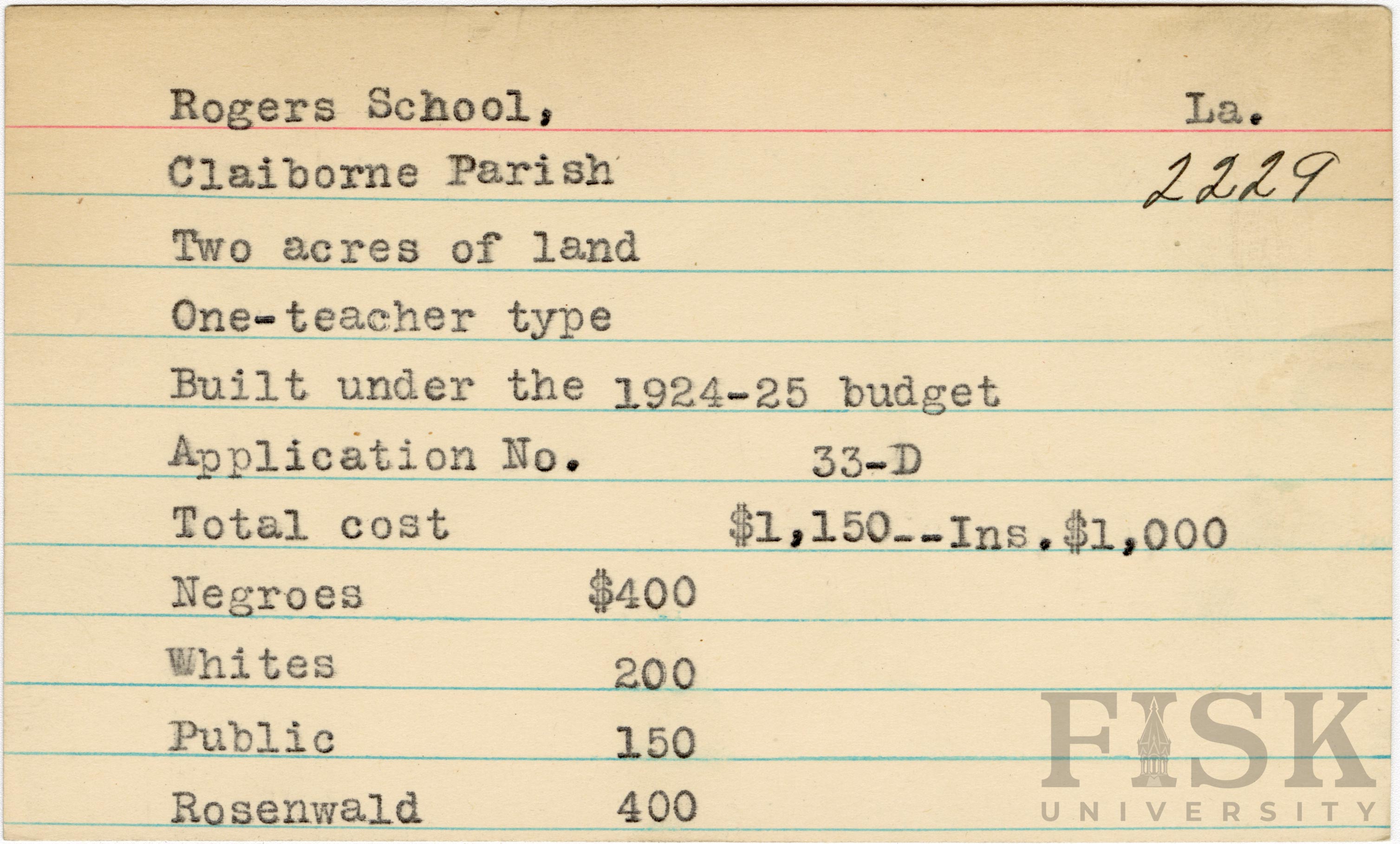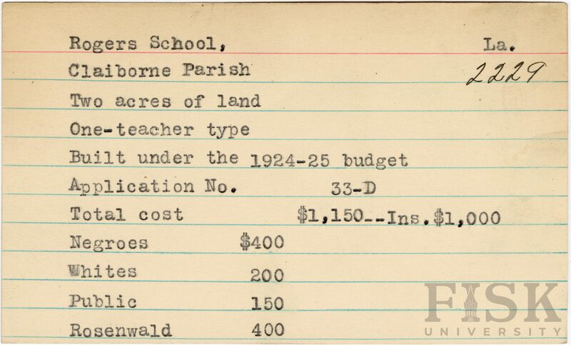 School card from the Rosenwald Fund for Rogers School in Claiborne Parish, Louisiana with a section added to the budget contributions that says, "Ins. $1,000"