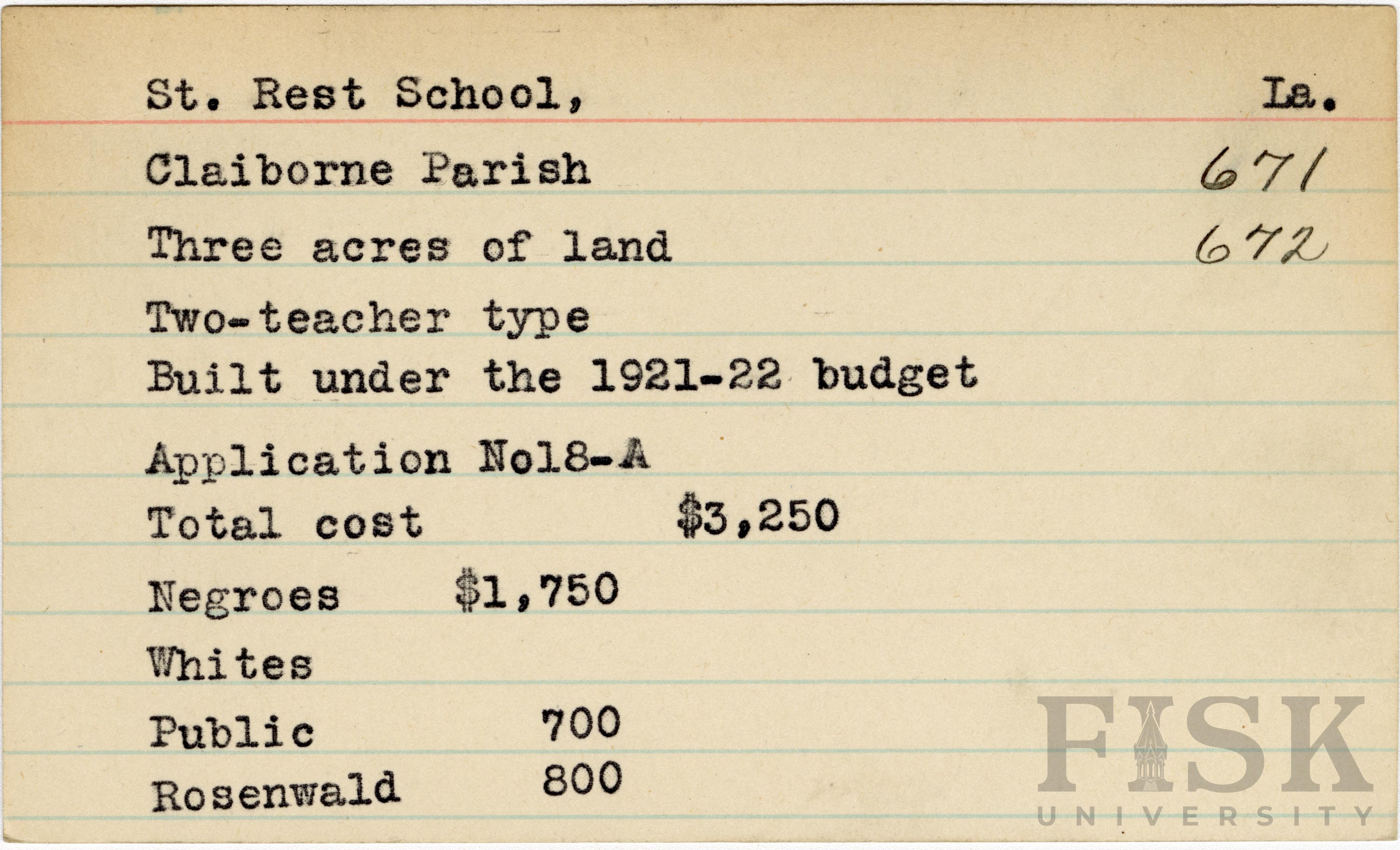 - School card from the Rosenwald Fund for St. Rest School in Claiborne Parish, Louisiana