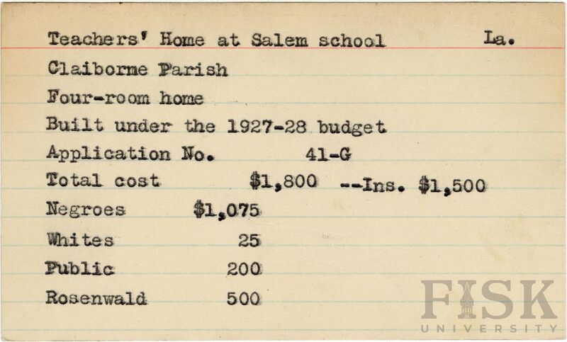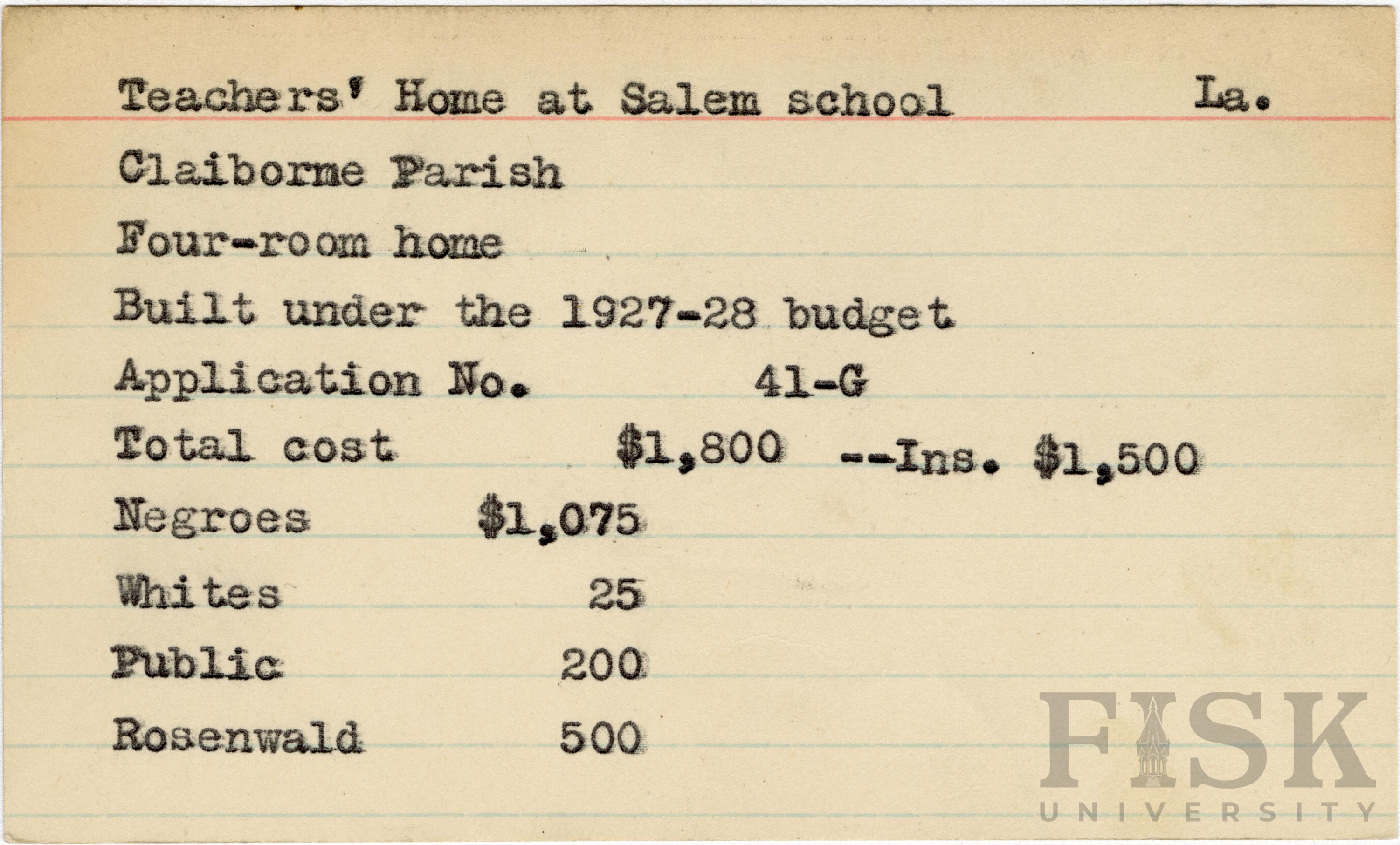 - School card from the Rosenwald Fund for the teacher's home at Salem School in Claiborne Parish, Louisiana with a section added to the budget contributions that say, "Ins. $1,500"