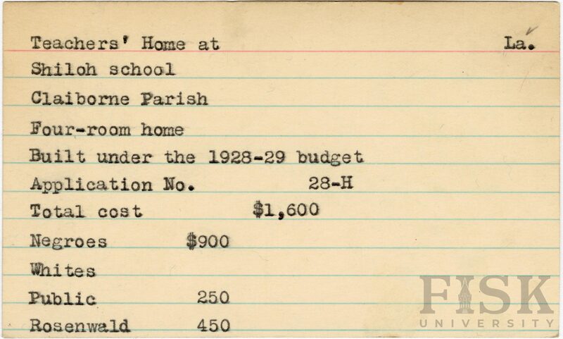 - School card from the Rosenwald Fund for the four room teacher's home at Shiloh School in Claiborne Parish, Louisiana