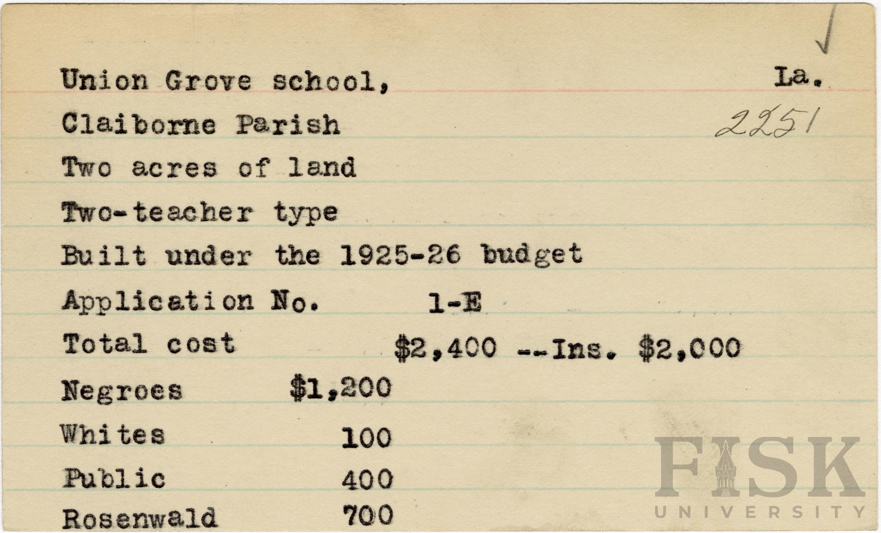 School card from the Rosenwald Fund for Union Grove School in Claiborne Parish, Louisiana with a section added to the budget contributions that says, "Ins. $2,000"