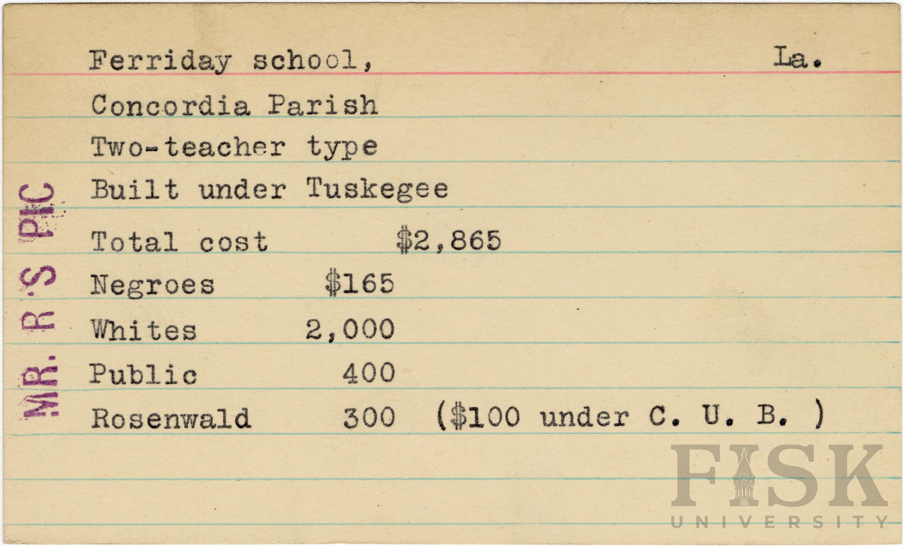 - School card from the Rosenwald Fund for Ferriday School in Concordia Parish, Louisiana with notes that say, "Mr. R's Pic" and "($100 under C. U. B.)"