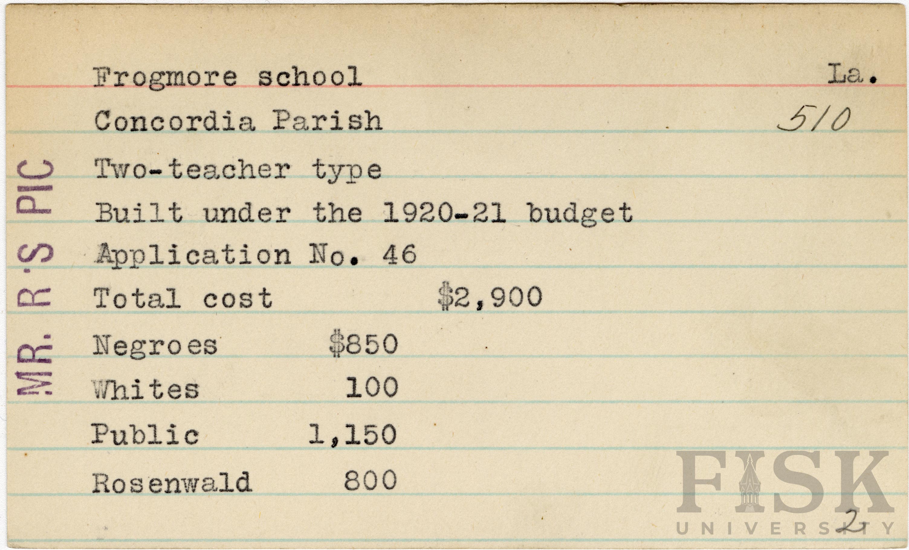 - School card from the Rosenwald Fund for Frogmore School in Concordia Parish, Louisiana with a note on the far left of the card that says, "Mr. R's Pic"