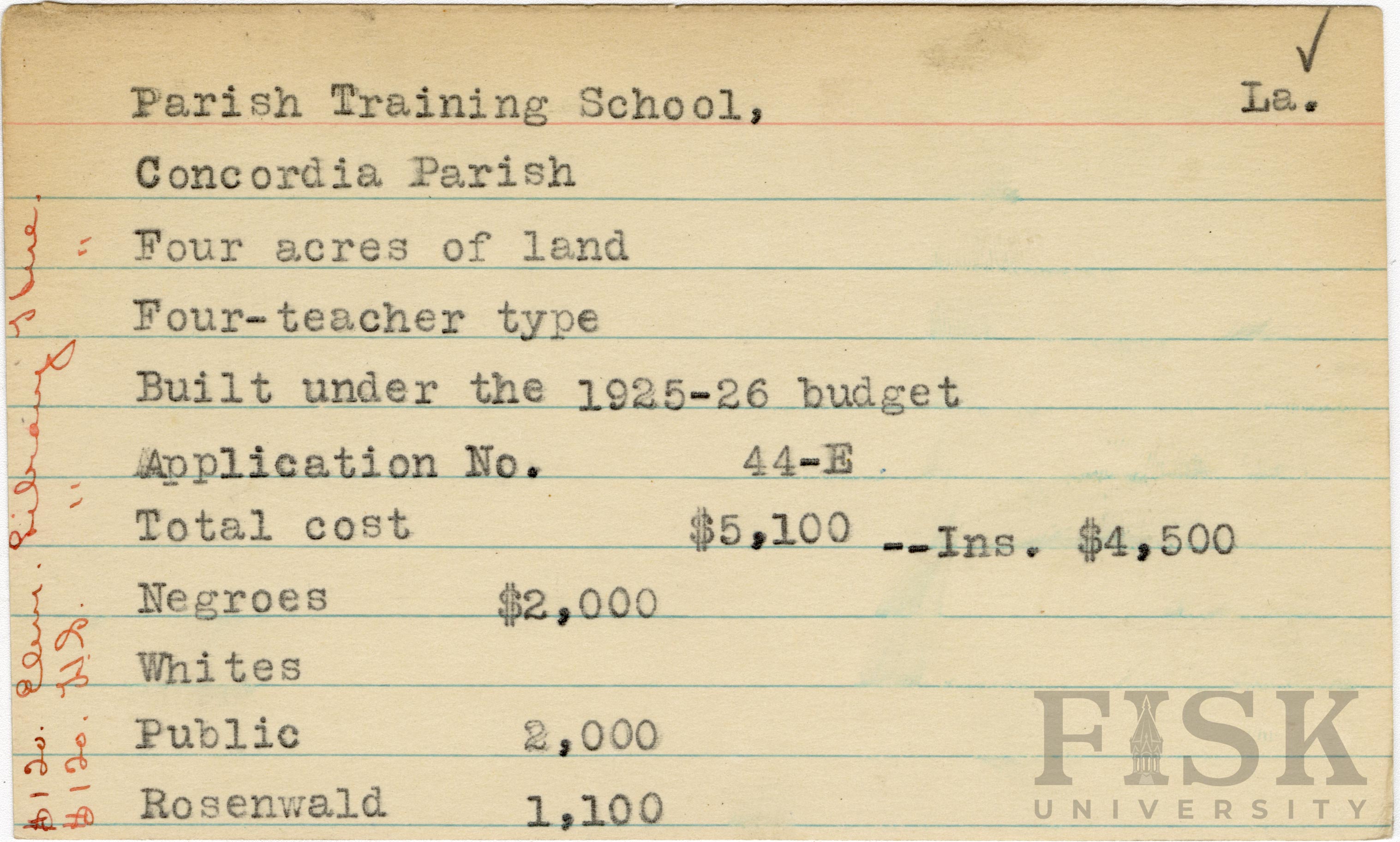 - School card from the Rosenwald Fund for Parish Training School in Concordia Parish, Louisiana with a section added to the budget contributions that says, "Ins. $4,500". Handwritten notes on the far left of the card say, "$120 elem library here" and "$120 H.S. library here"