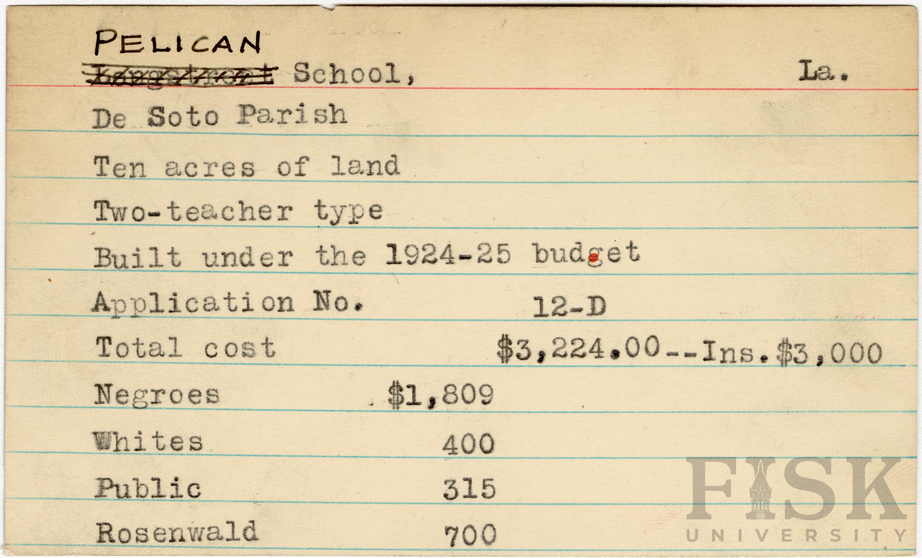 School card from the Rosenwald Fund for Pelican School in DeSoto Parish, Louisiana with a section added to the budget contributions that says, "Ins. $3,000"