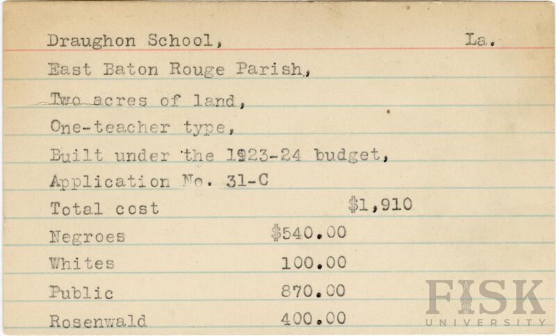 - School card from the Rosenwald Fund for Draughon School in East Baton Rouge Parish, Louisiana