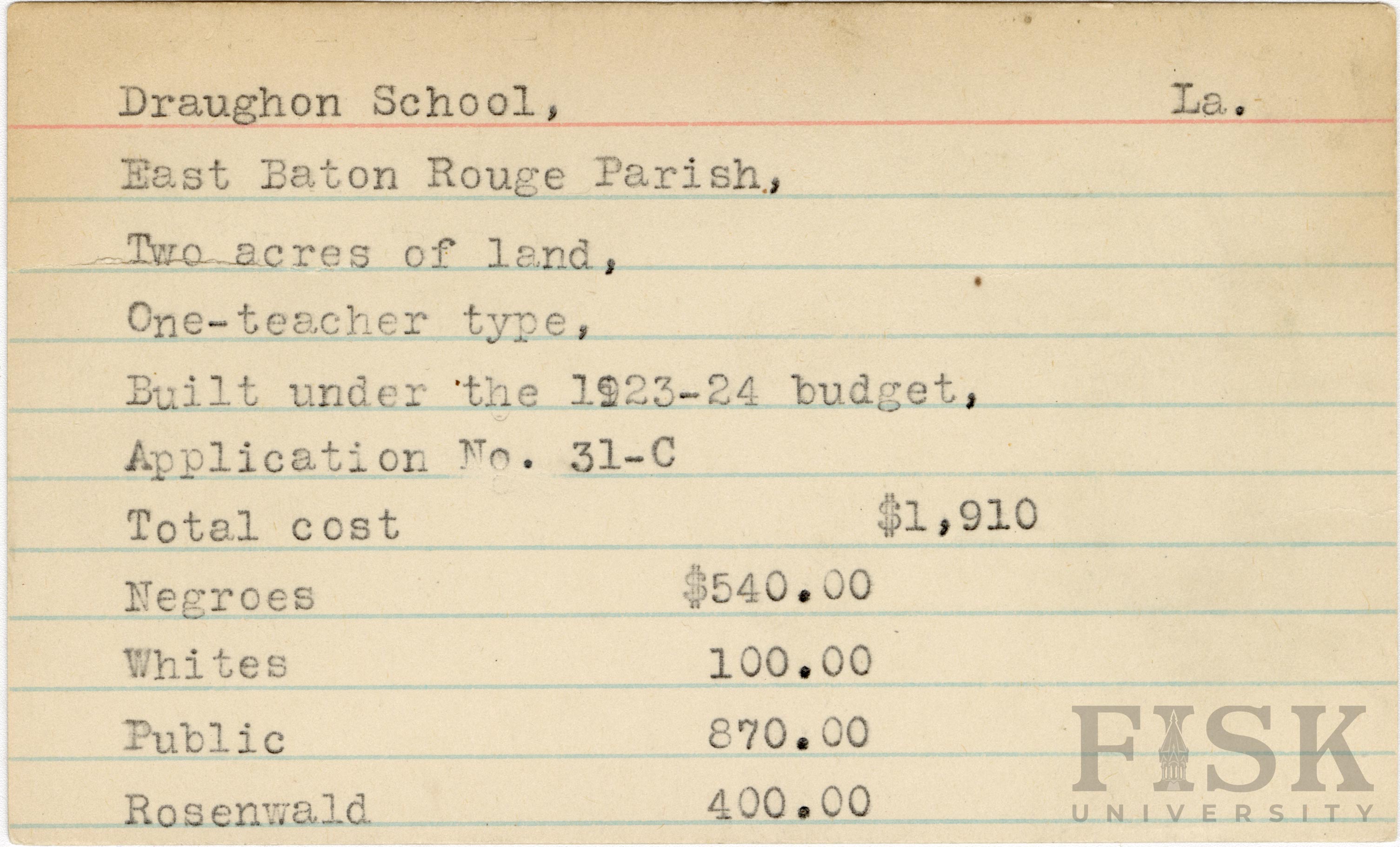 School card from the Rosenwald Fund for Draughon School in East Baton Rouge Parish, Louisiana