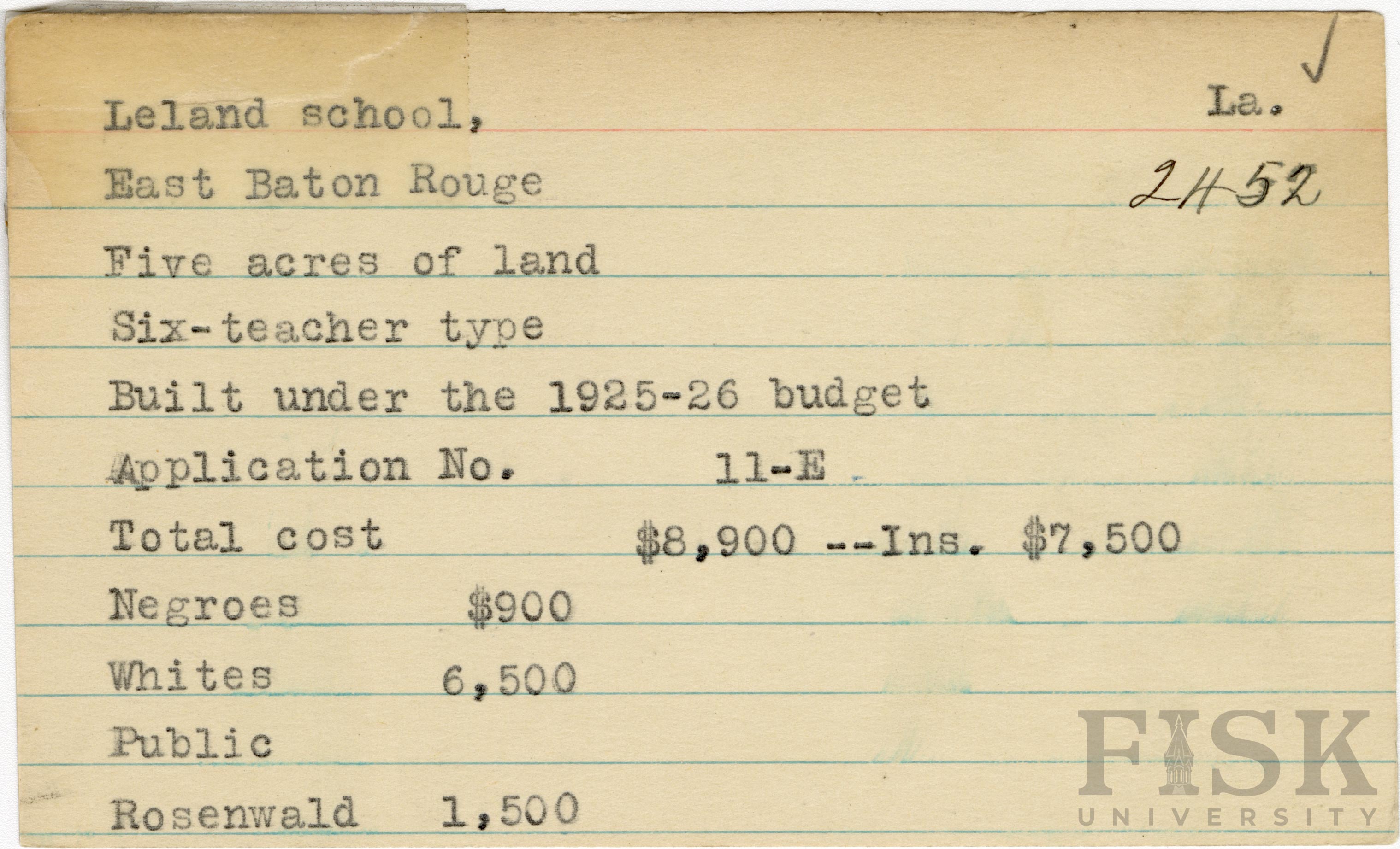 - School card from the Rosenwald Fund for Leland School in East Baton Rouge Parish, Louisiana with a section added to the budget contributions that says, "Ins. $7,500"