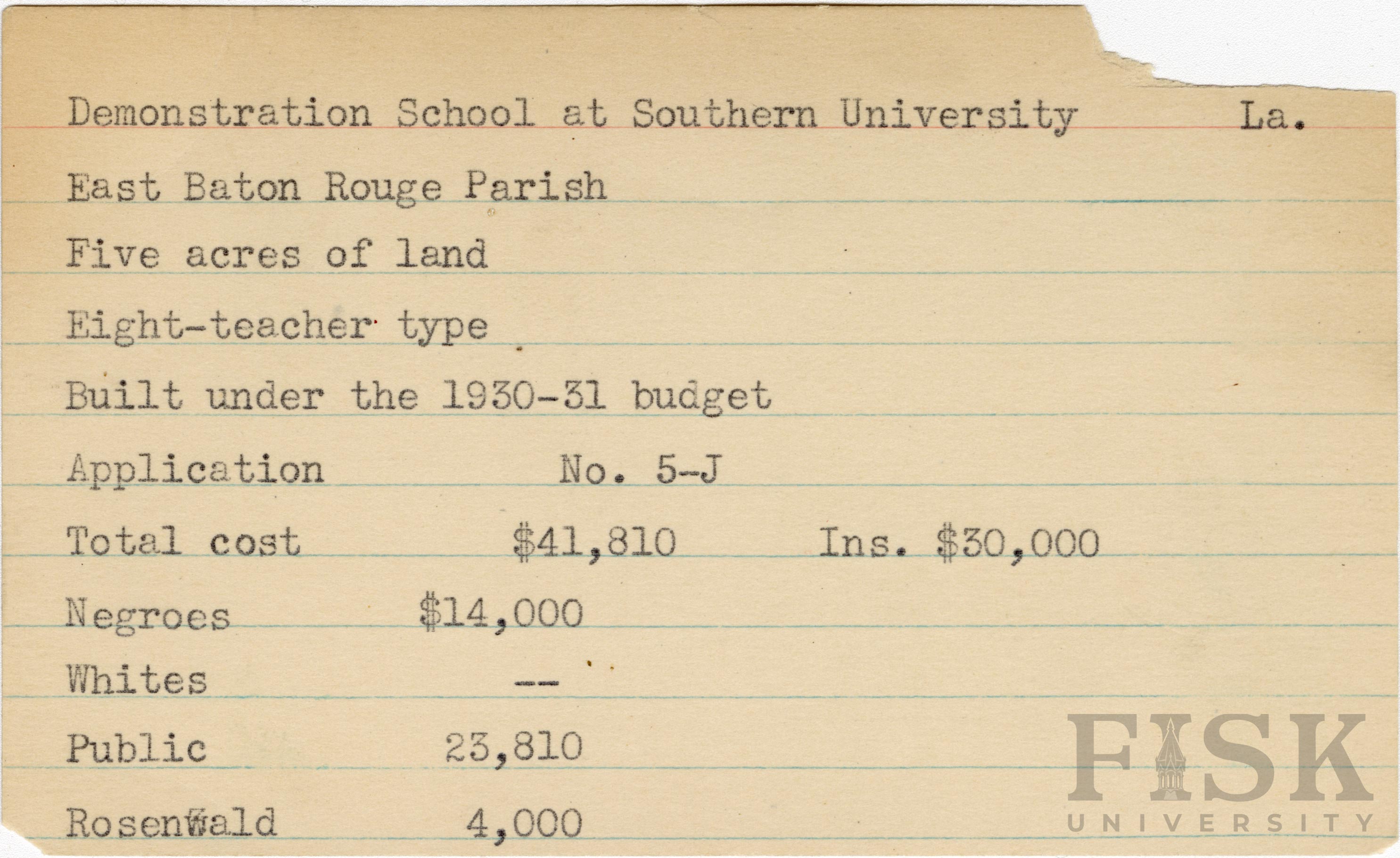 - School card from the Rosenwald Fund for Demonstration School at Southern University in East Baton Rouge Parish, Louisiana with a section added to the budget contributions that says, "Ins. $30,000"