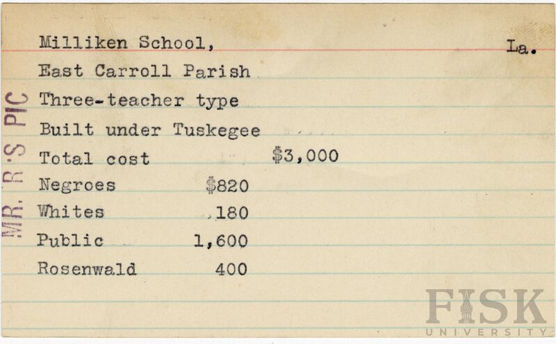 School card from the Rosenwald Fund for Milliken School in East Carroll Parish, Louisiana with a note added to the far left of the card that says, "Mr. R's Pic"