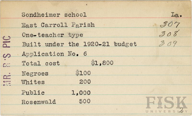 - School card from the Rosenwald Fund for Sondheimer School in East Carroll Parish, Louisiana with a note added to the far left of the card that says, "Mr. R's Pic"