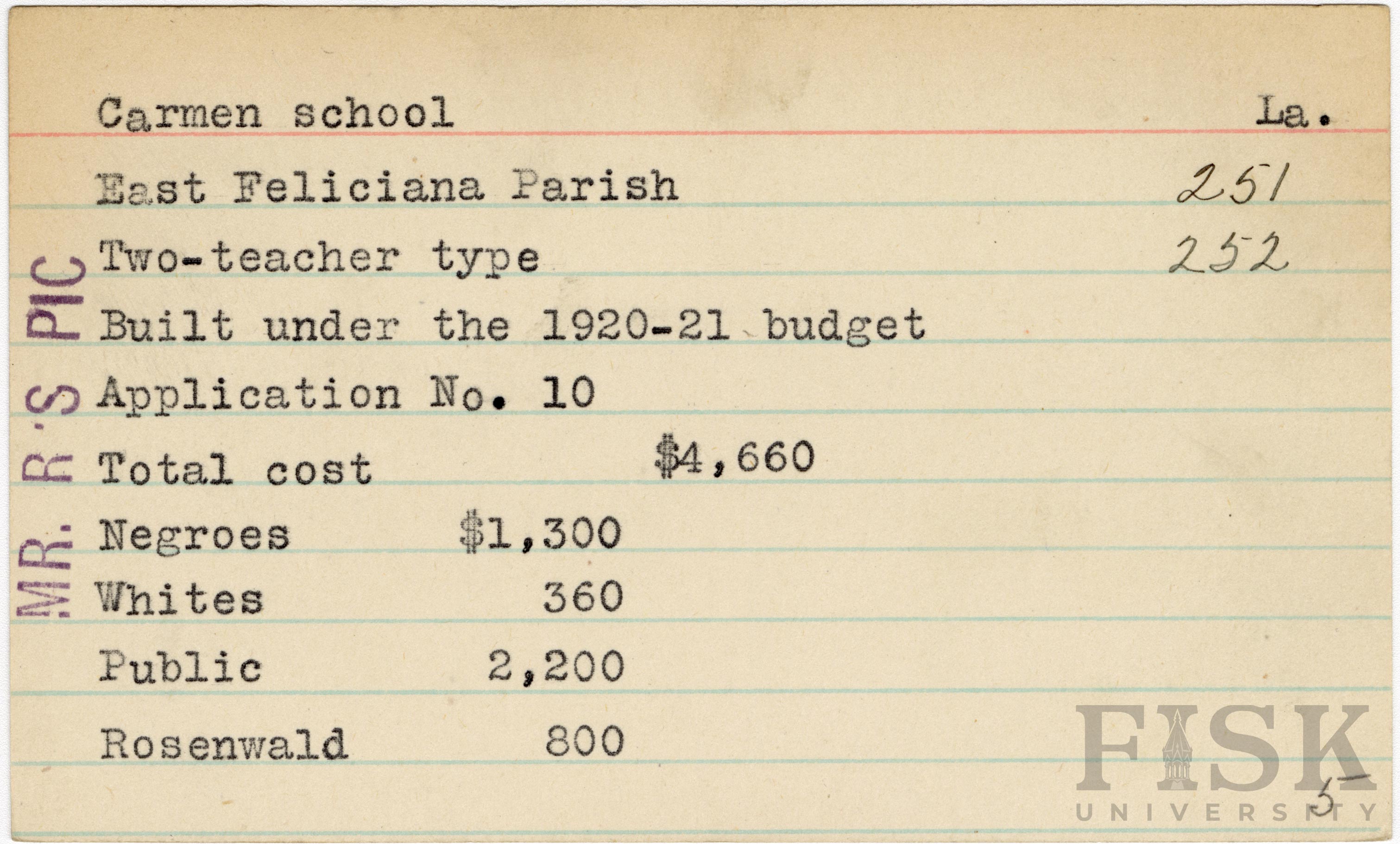 - School card from the Rosenwald Fund for Carmen School in East Felicia Parish, Louisiana with a note on the far left of the card that says, "Mr. R's Pic"