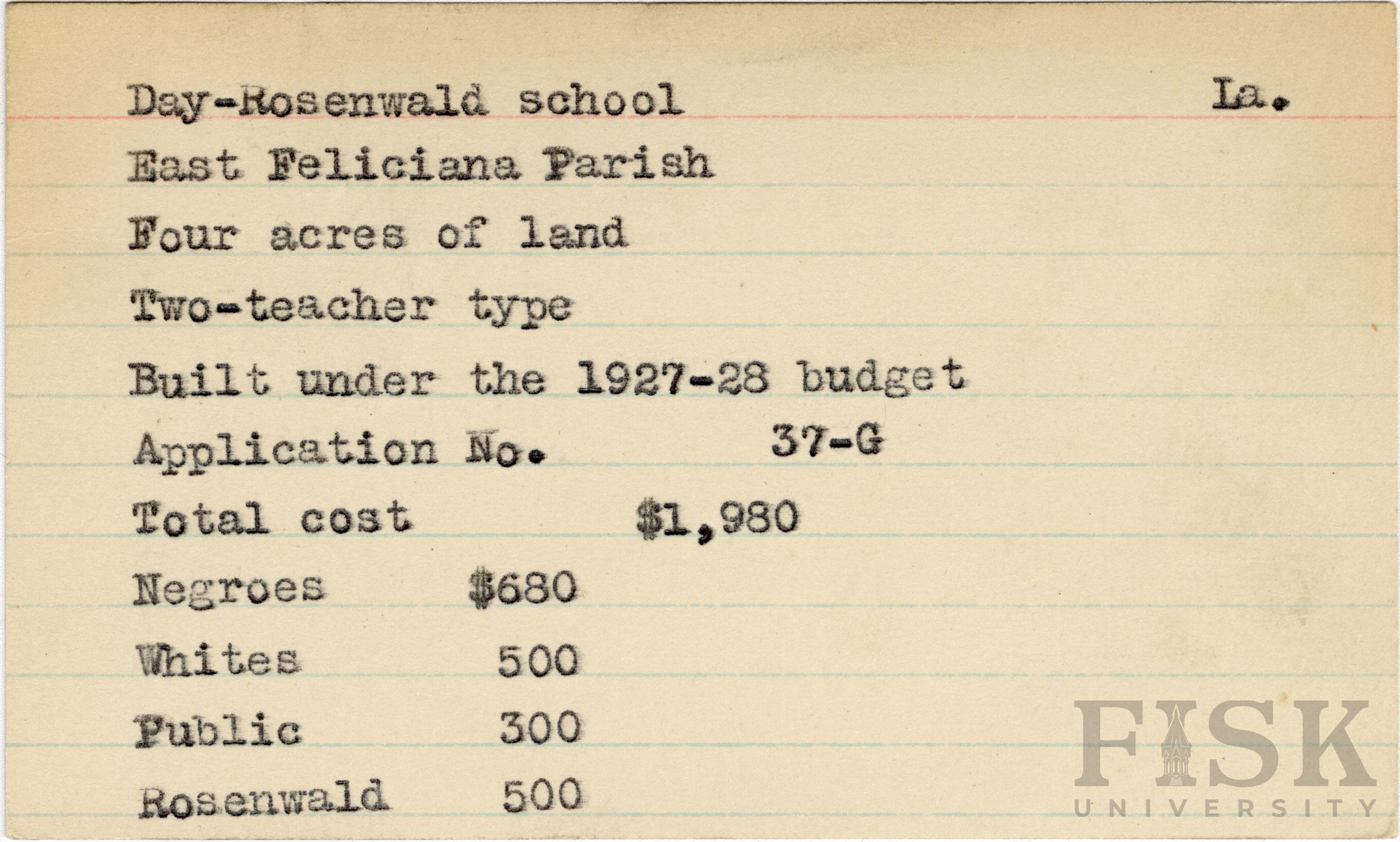 School card from the Rosenwald Fund for Day-Rosenwald School in East Felicia Parish, Louisiana