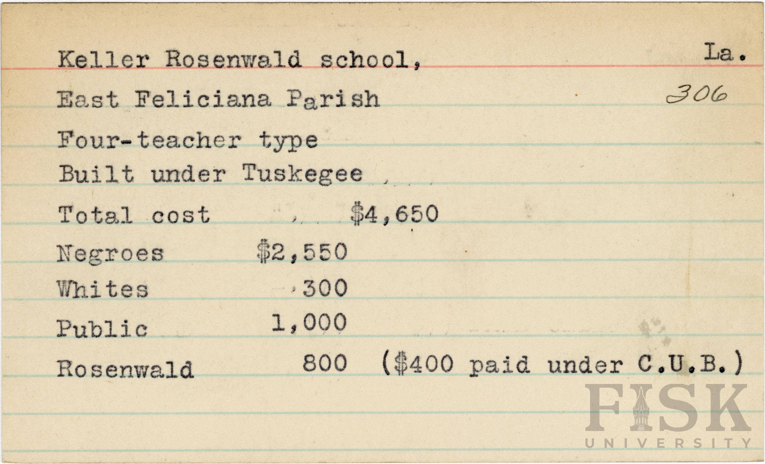 - School card from the Rosenwald Fund for Keller Rosenwald School in East Felicia Parish, Louisiana with a note added to the Rosenwald budget contributions that says, "($400 paid under C.U.B.)"
