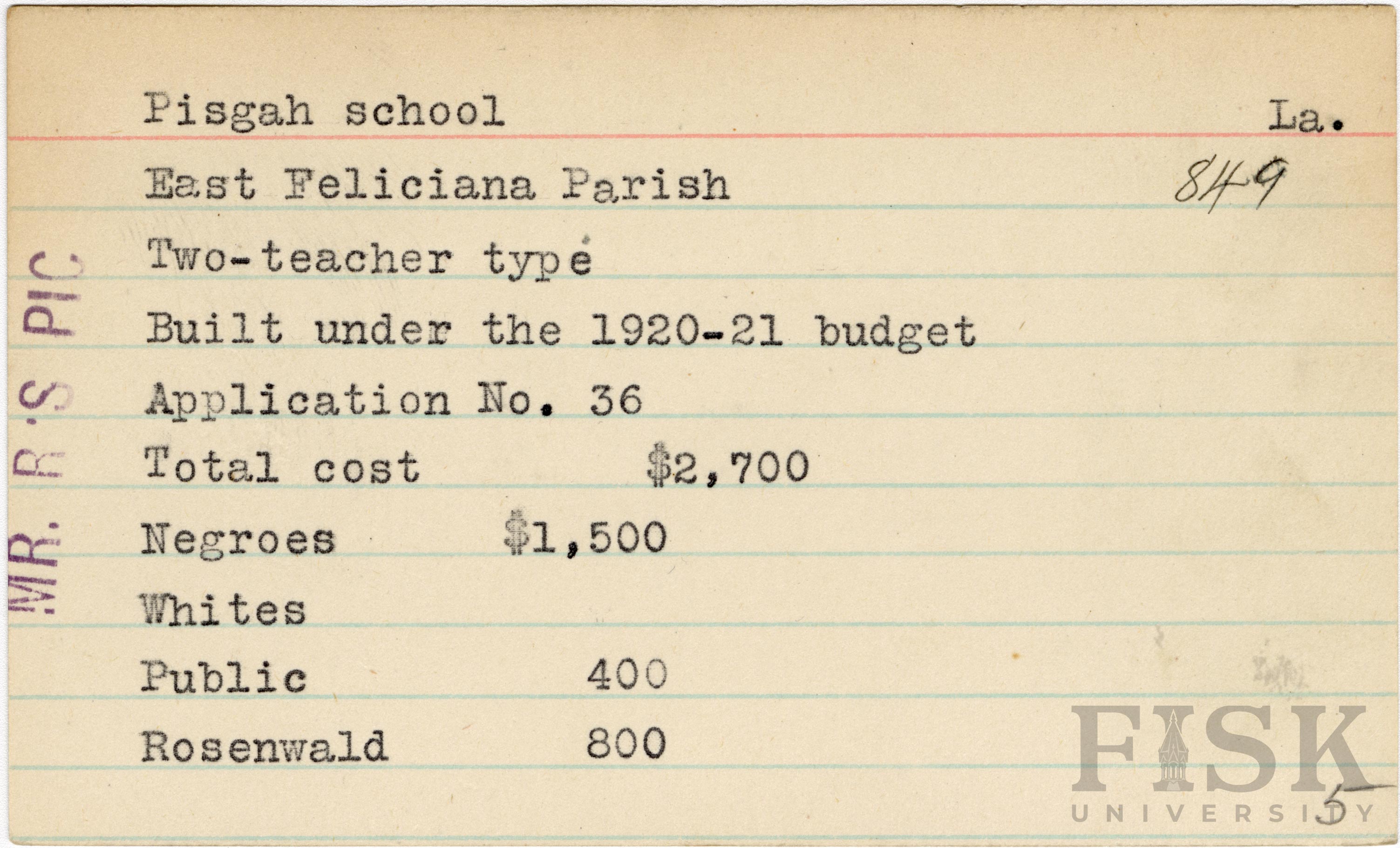 - School card from the Rosenwald Fund for Pisgah School in East Felicia Parish, Louisiana with a note added to the far left of the card that says, "Mr. R's Pic"