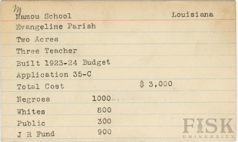 School card from the Rosenwald Fund for Namou School in Evangeline Parish, Louisiana with a handwritten "M" at the top of the card above the "N" in Namou.