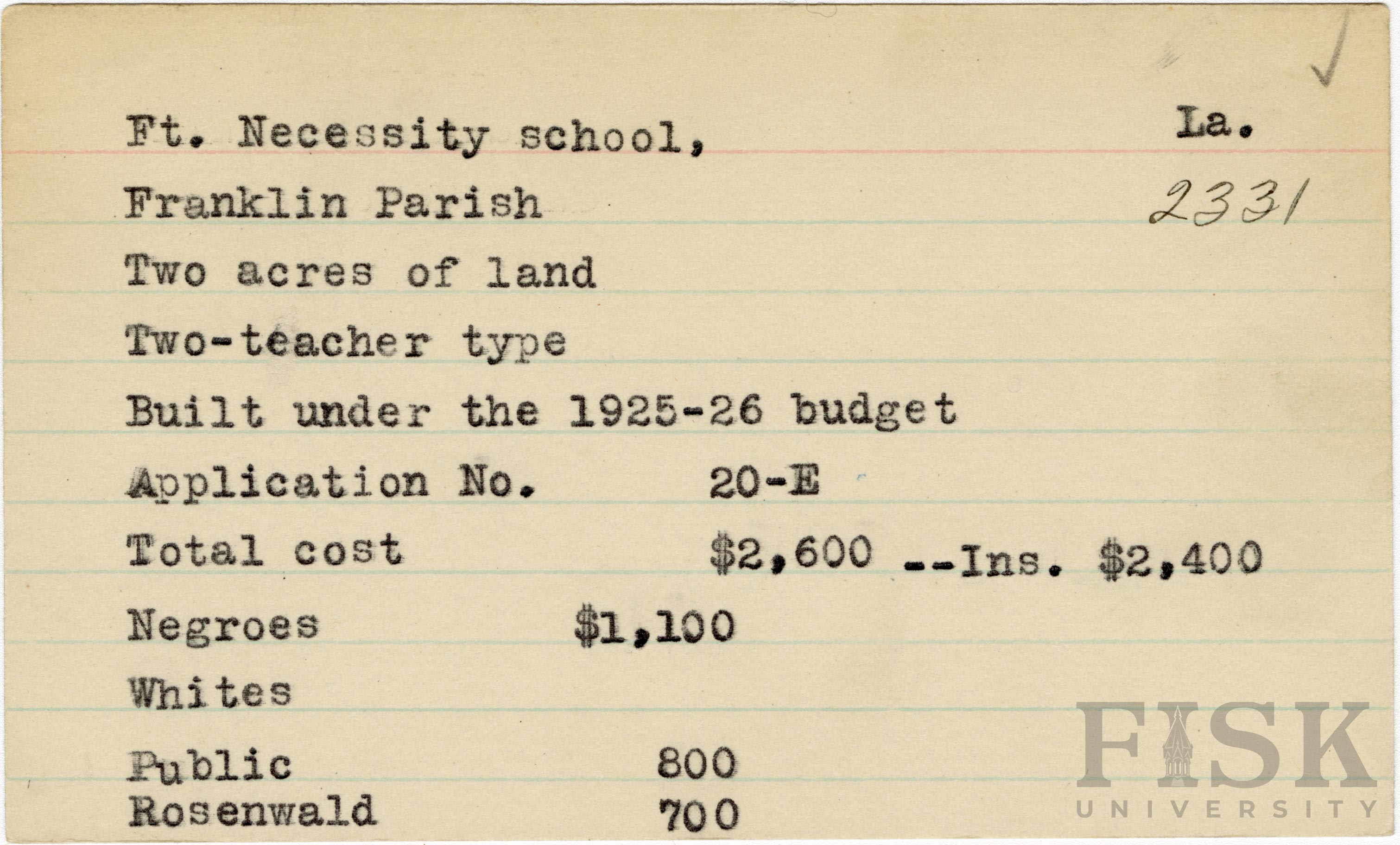 - School card from the Rosenwald Fund for Ft. Necessity School in Franklin Parish, Louisiana with a section added to the budget contributions that says, "Ins. $2,400"