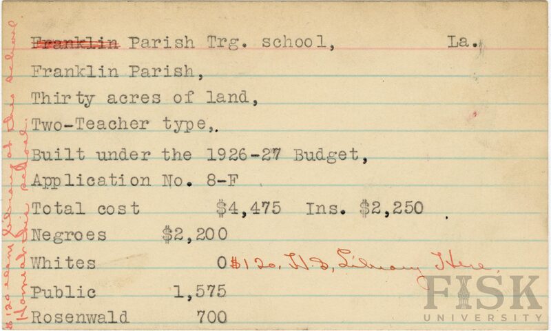 - School card from the Rosenwald Fund for Parish Training School in Franklin Parish, Louisiana with handwritten notes that say, "$120 elem library at this school", "home at this school", and "$120 H.S. library here".