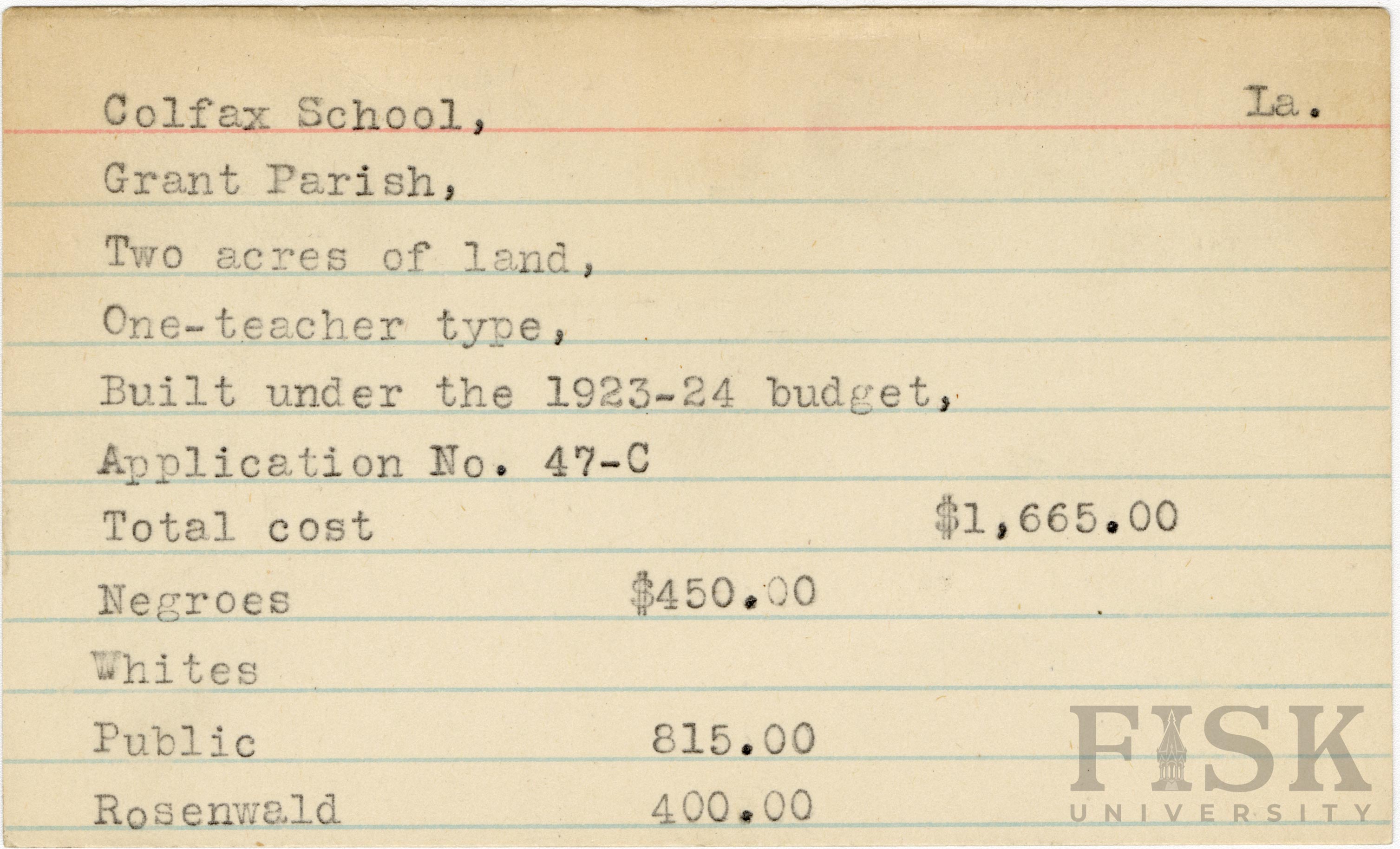- School card from the Rosenwald Fund for Colfax School in Grant Parish, Louisiana