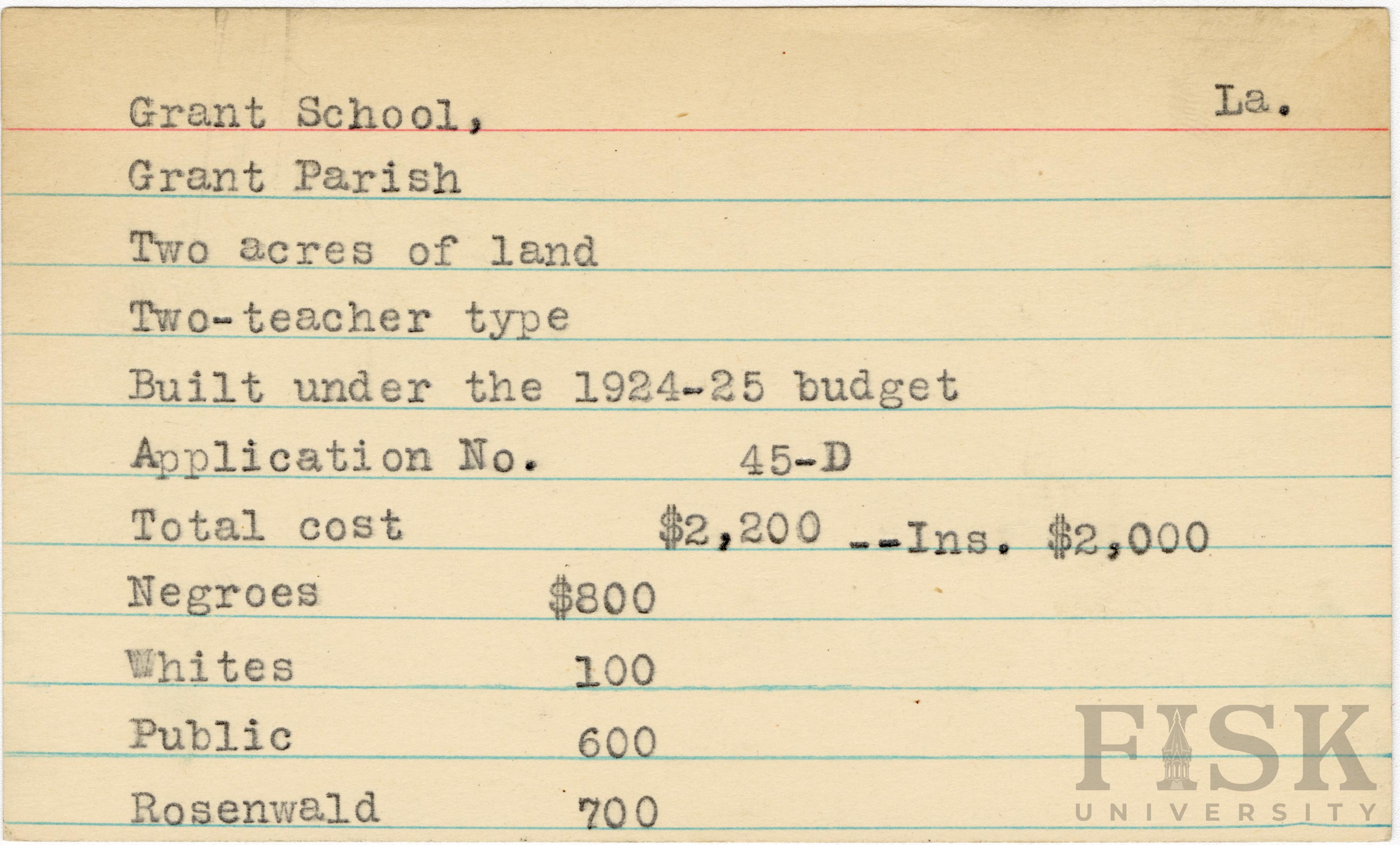 School card from the Rosenwald Fund for Grant School in Grant Parish, Louisiana with a section added to the budget contributions that says, "Ins. $2,000"