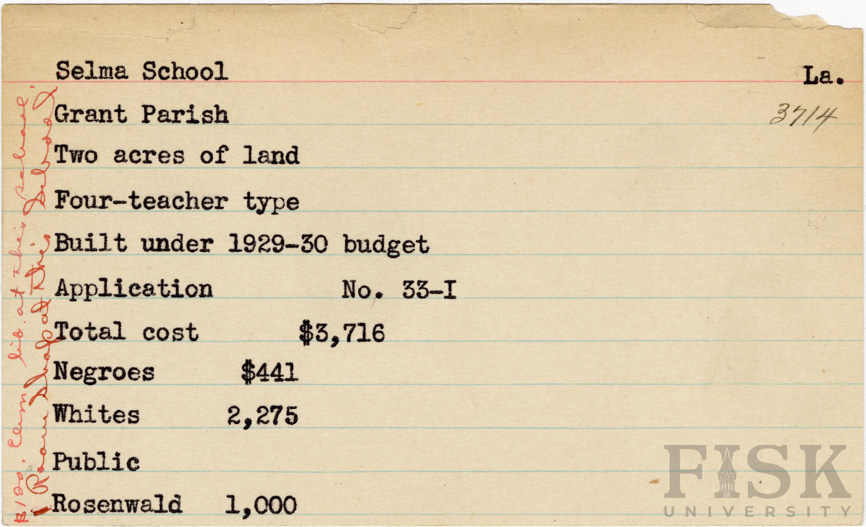 - School card from the Rosenwald Fund for Selma School in Grant Parish, Louisiana with handwritten notes on the far left of the card that say, "$120 elem lib at this school" and "1 room shop at this school"