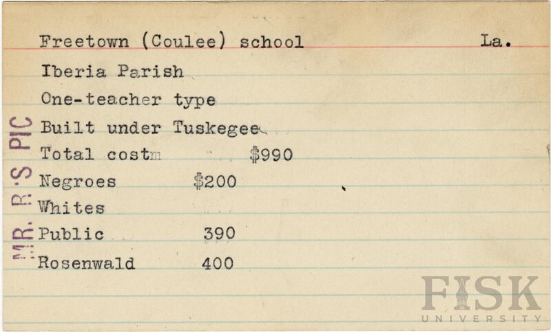 School card from the Rosenwald Fund for Freetown School in Iberia Parish, Louisiana with a note on the far left of the card that says, "Mr. R's Pic"