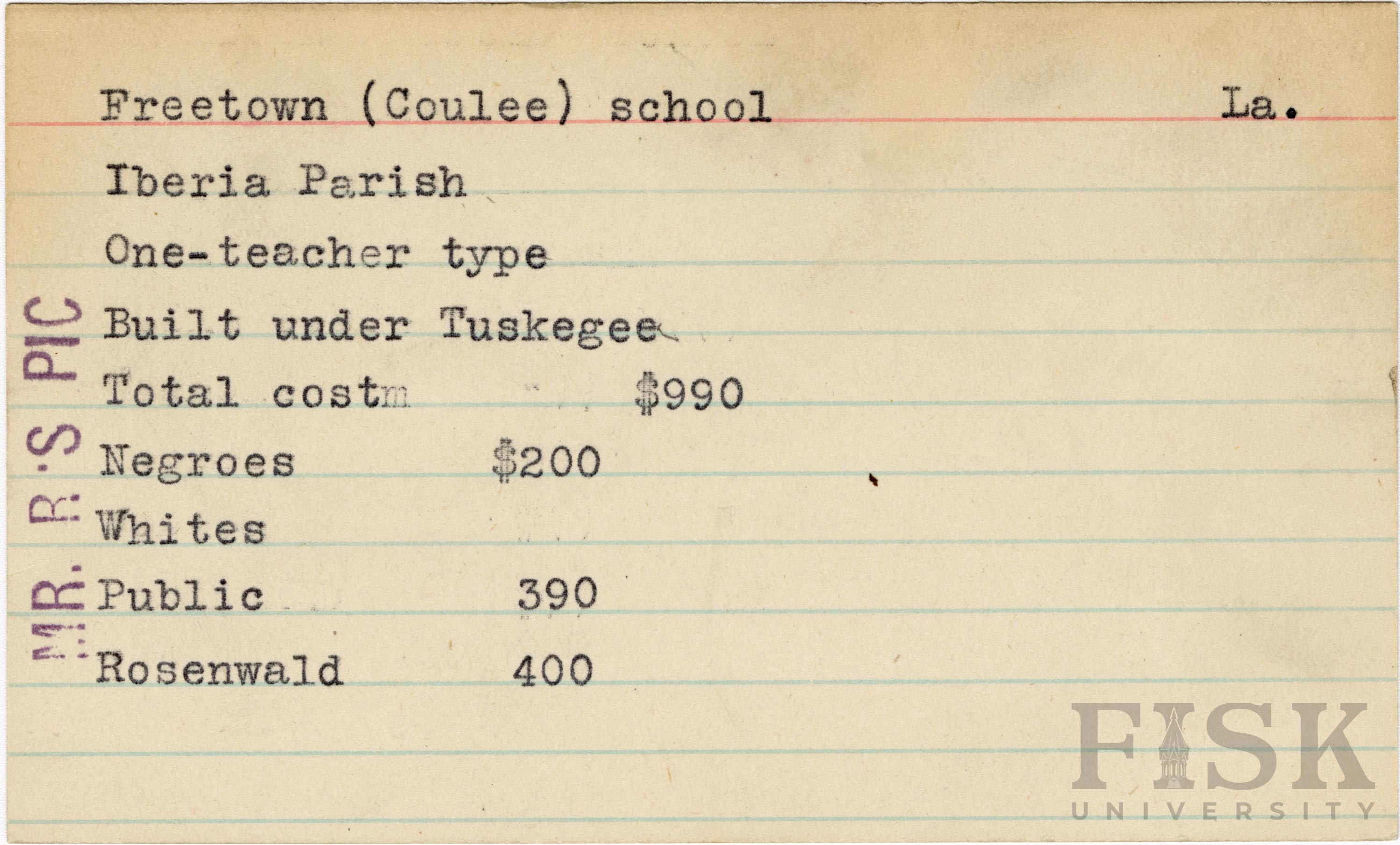 - School card from the Rosenwald Fund for Freetown School in Iberia Parish, Louisiana with a note on the far left of the card that says, "Mr. R's Pic"