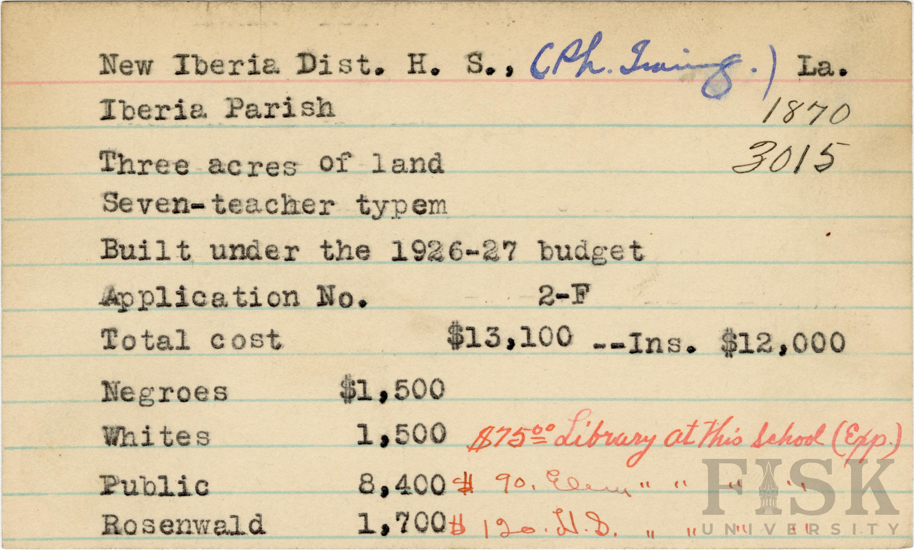 - School card from the Rosenwald Fund for New Iberia District High School in Iberia Parish, Louisiana with a section added to the budget contribution that says, "Ins. $12,000". Handwritten notes on the card say, "$75.00 library at this school (Exp)", "$90 elem library at this school", and "$120 H.S. library at this school".